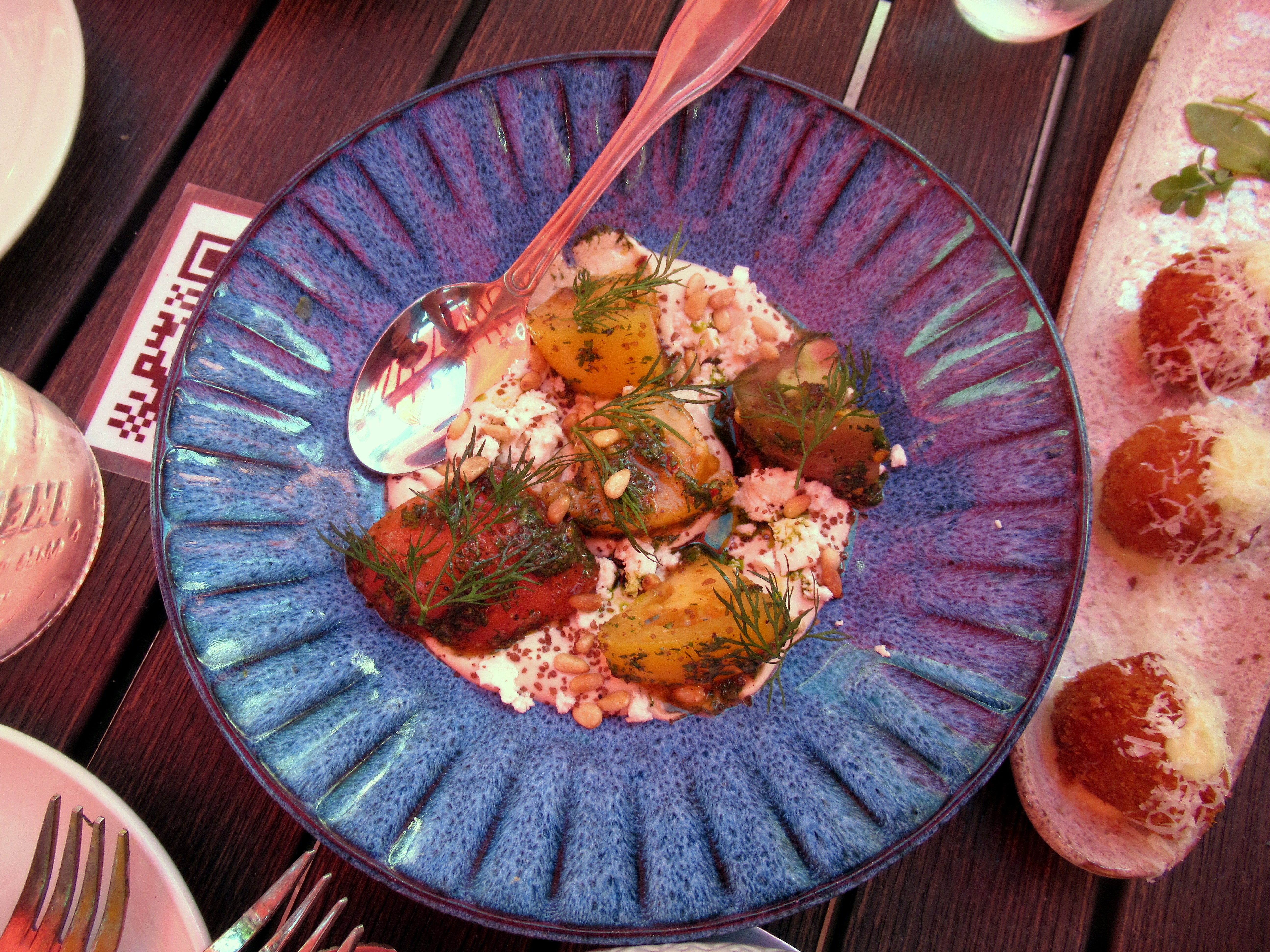 An outstanding dinner from Fandi Mata, including heirloom tomatoes with lemon tahini crema, dill mojo, toasted pine nuts, smoked salt, and feta cheese.