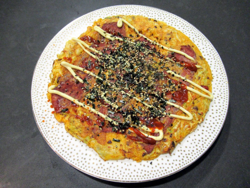 And I put leftover bacon in some homemade okonomiyaki (eggy cabbage pancakes). I also stuffed it with ginger and chili crisp and topped it with Sriracha, Kewpie, and furikaki.