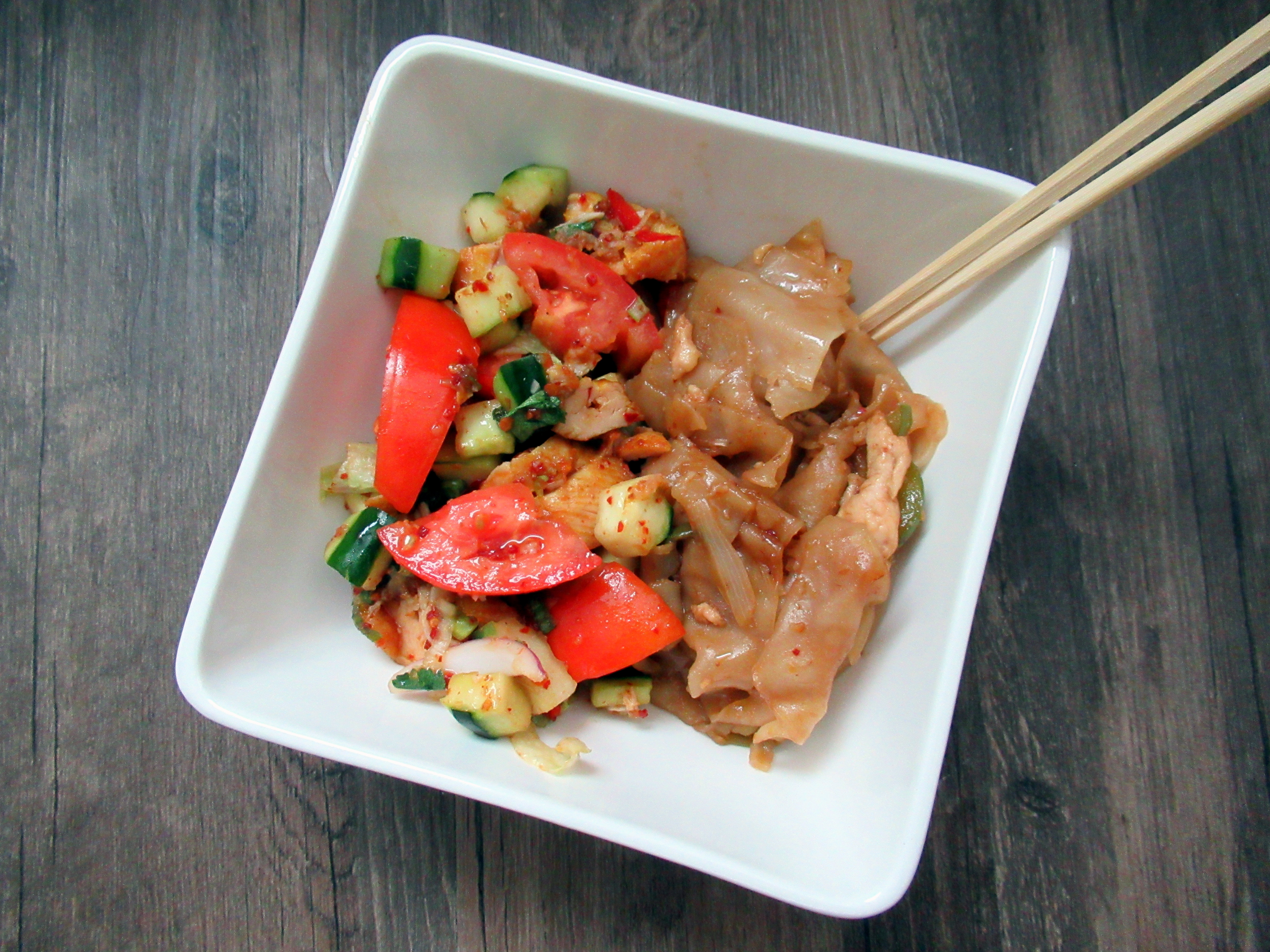 Thai take-out dinner. Drunken noodles plus spicy chicken salad with cucumber and tomato.