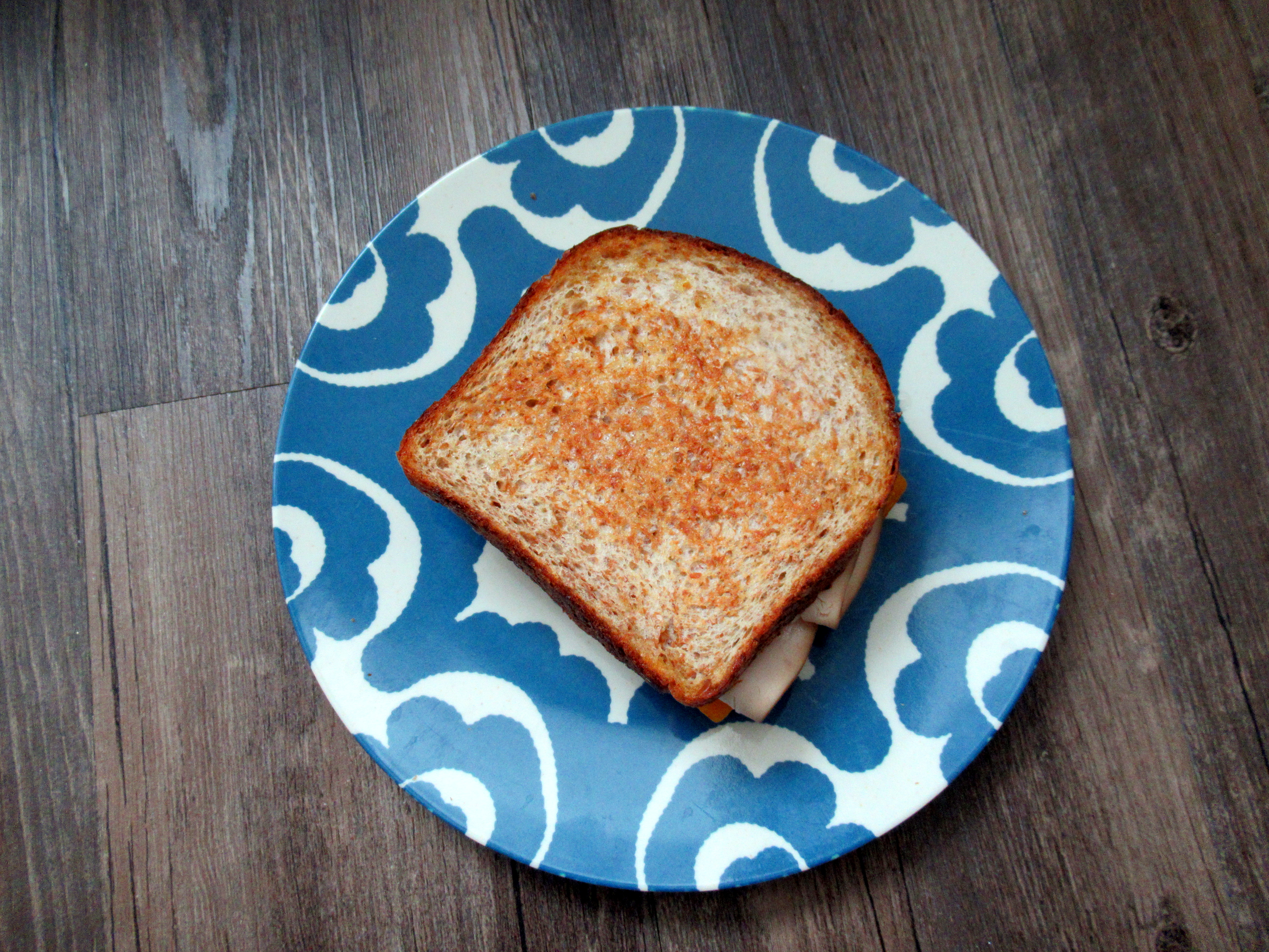 Toasted turkey and cheddar sandwich. On sprouted wheat sourdough with mayo and pickled jalapeños.