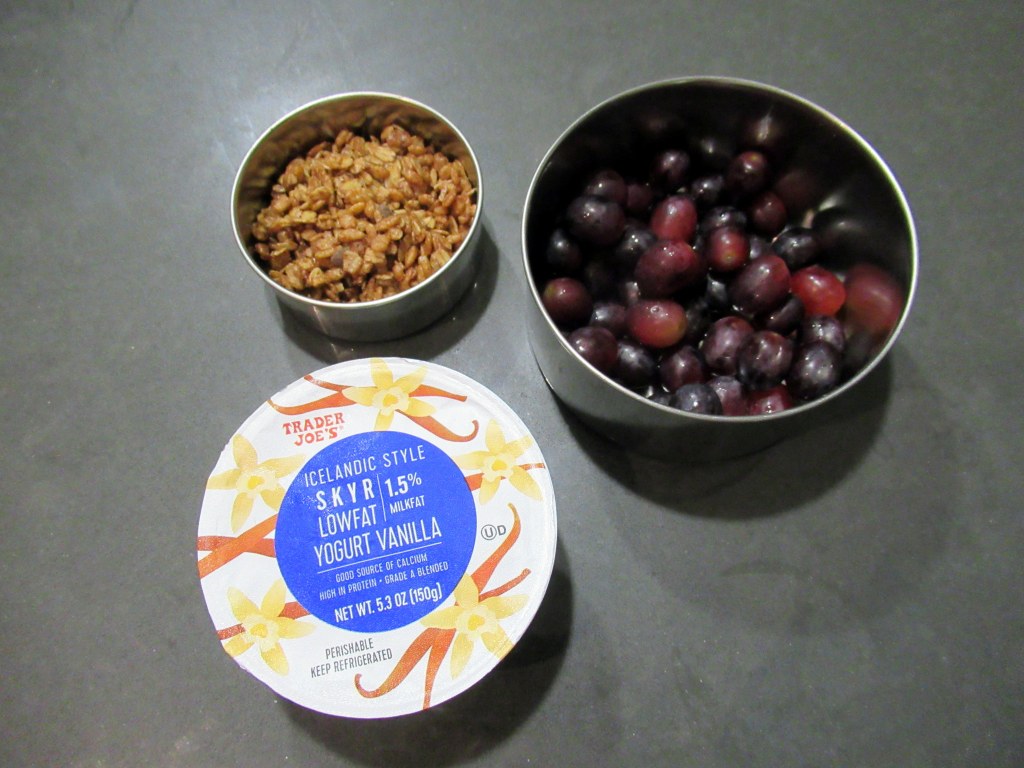 Yogurt bowl set up – vanilla skyr with Made Good chocolate granola and Jelly Berry grapes.