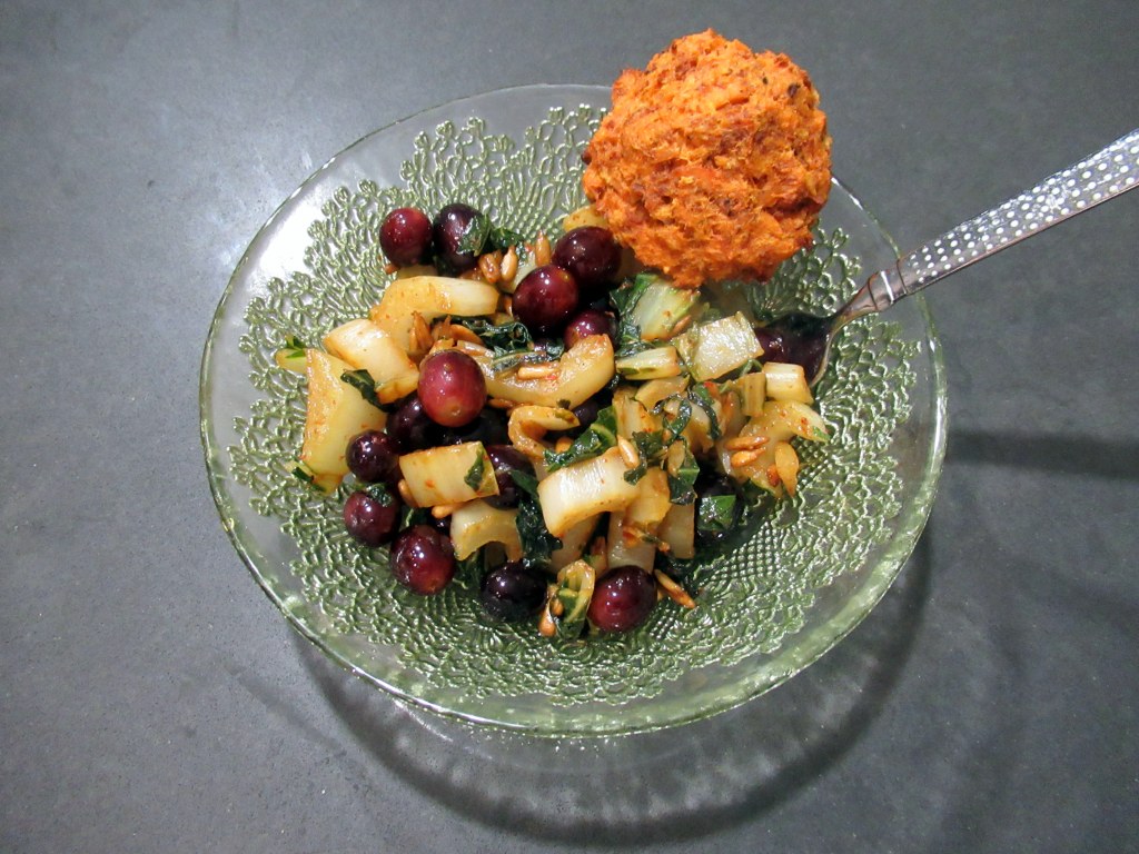 Dinner inspired by a dish we loved recently at Llama Inn – sautéed bok choy with grapes, sunflower seeds, and black garlic vinaigrette. Plus tuna cakes made with soyrizo.