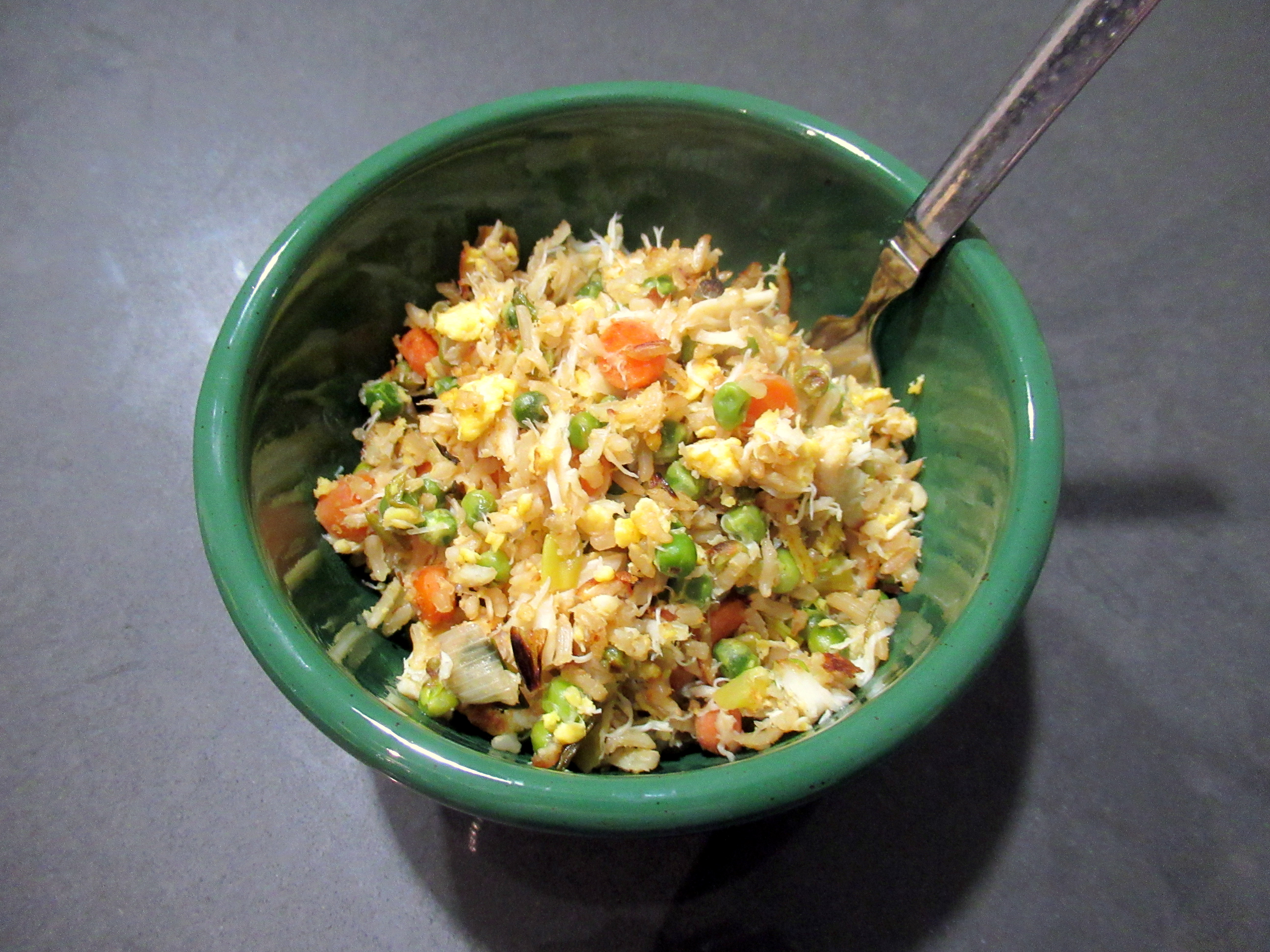 Crab fried rice. Leftover brown rice stir-fried (with soy sauce, rice vinegar, and fish sauce) with blue crab, eggs, green onion, peas, and carrot.