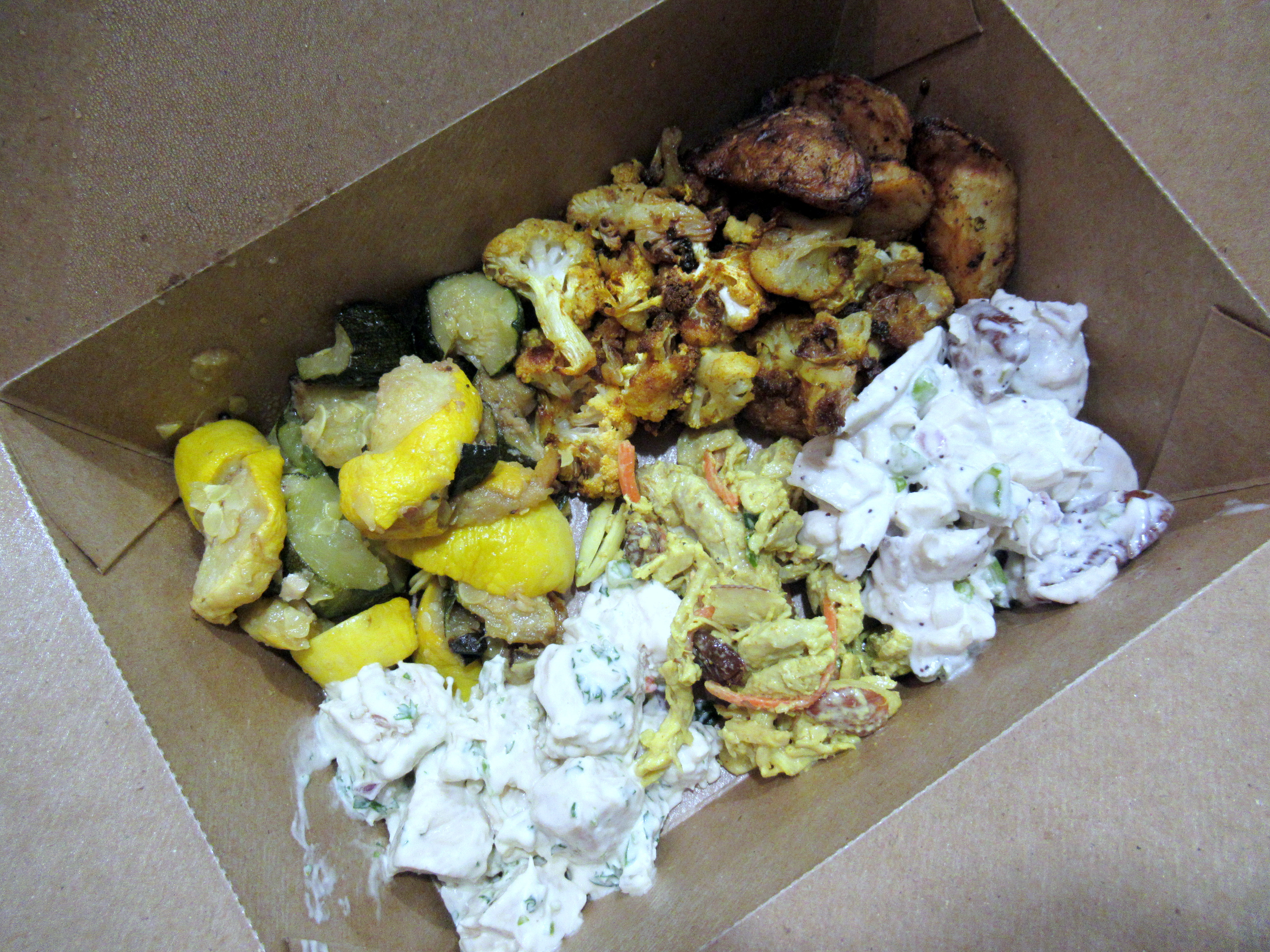 Whole Foods hot bar – yellow squash and zucchini, curried cauliflower, roasted potato wedges, and three types of chicken salad.