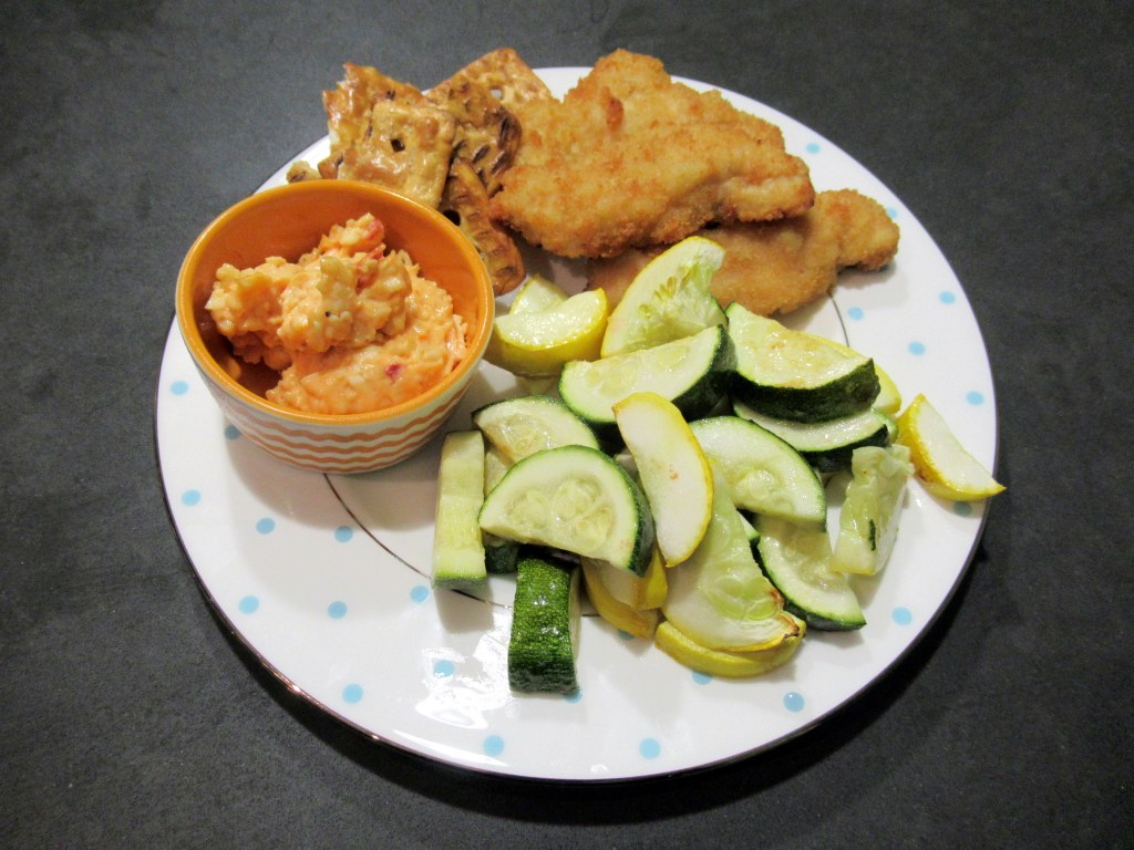 Chicken tenders, pretzels, and roasted yellow squash and zucchini, with pimento cheese.