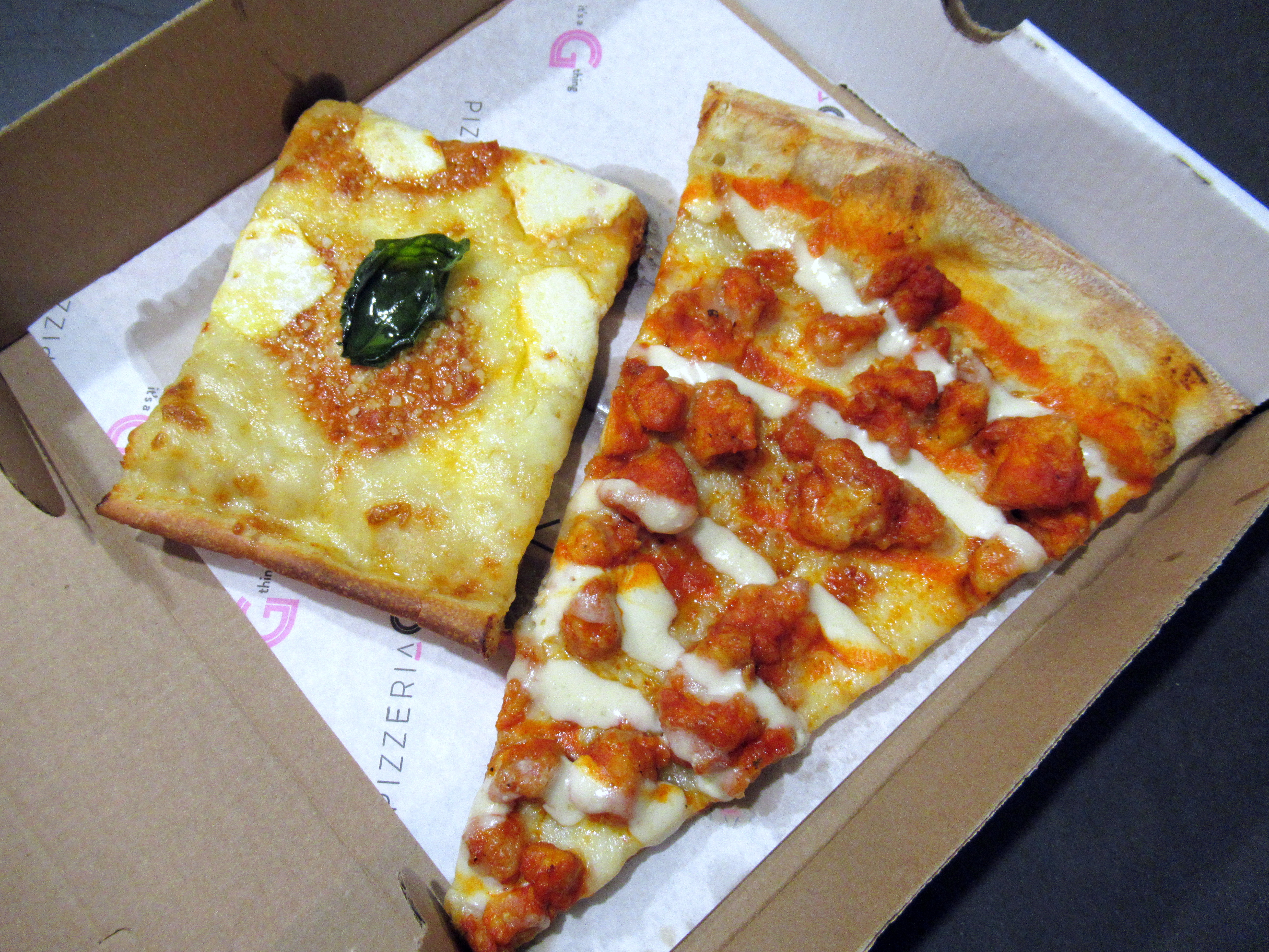 Take-out pizza – buffalo chicken and a vodka grandma slice – with leftover roasted yellow squash and zucchini. I probably should vary my vegetables a bit next week!