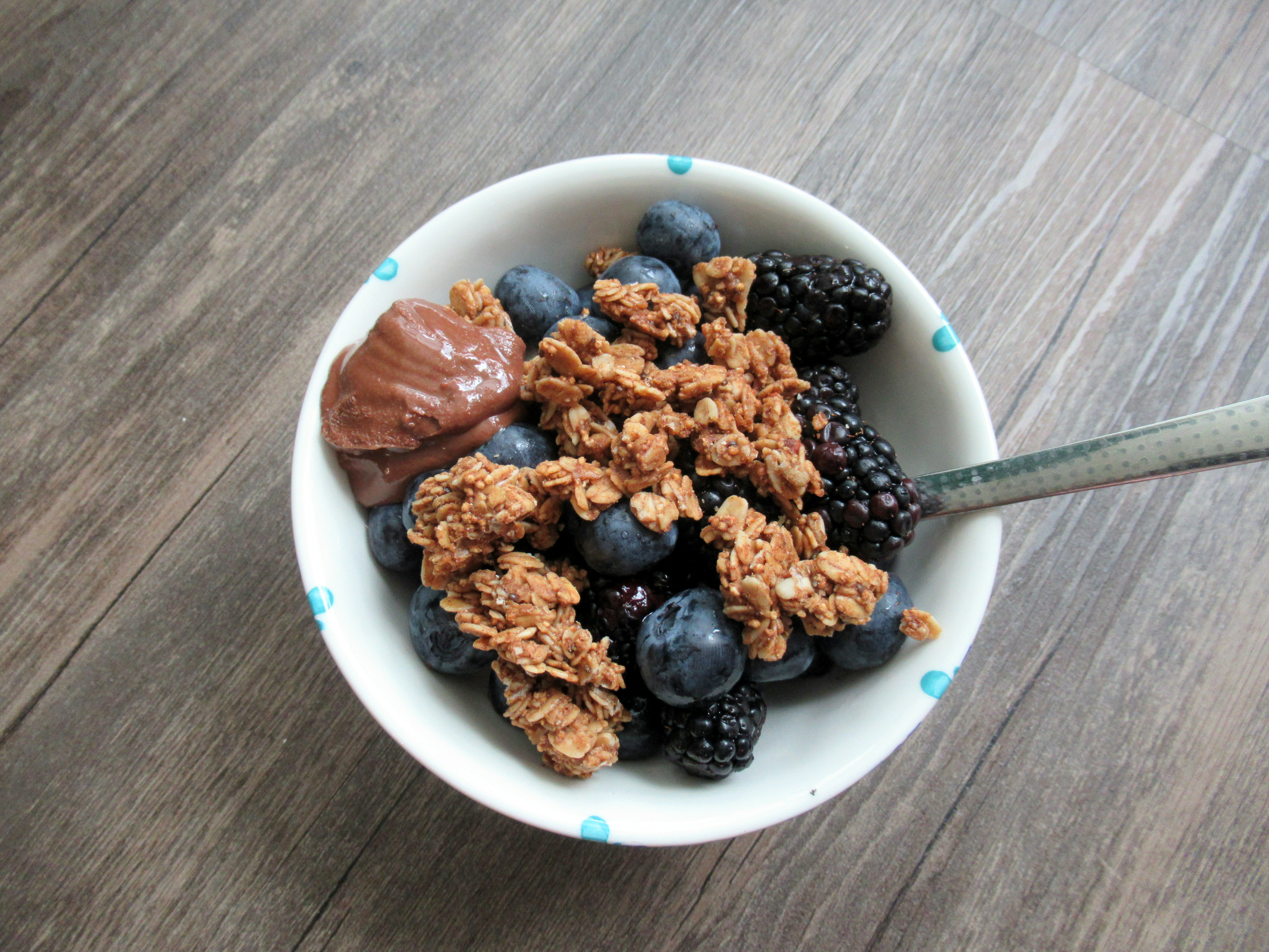 Honey yogurt with blackberries, JUMBO blueberries, maple almond butter granola, and dark chocolate sunflower seed butter.