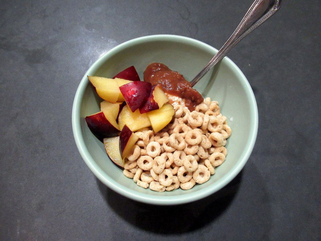 Yogurt with red plum, cheerios, cinnamon, and mulled cider apple butter (sent from my grandmother in Ohio; thanks, Nana!).