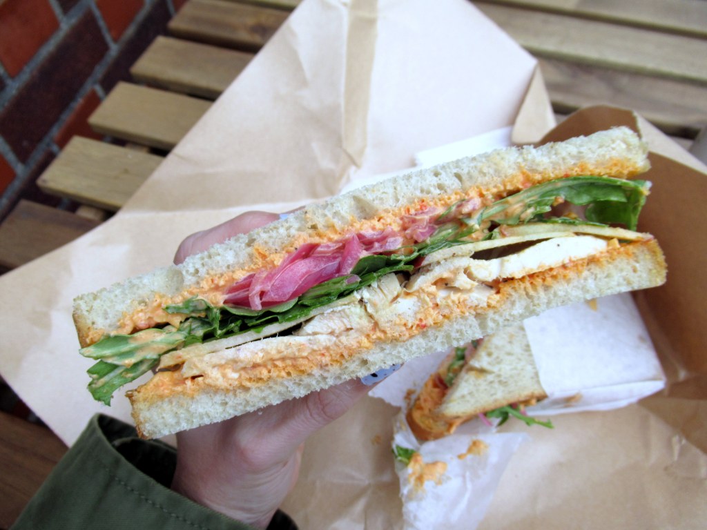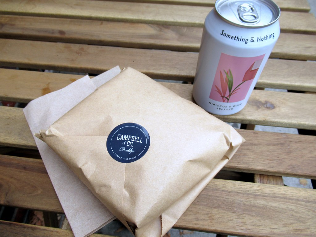 A very summery sandwich and seltzer from Campbell’s. Smoked chicken, pimento cheese, green apples, pickled onions, mayo, and arugula on sourdough + hibiscus and rose.