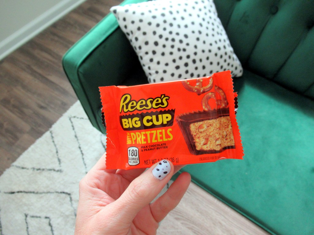 I am 100% obsessed with these pretzel-stuffed peanut butter cups. I bought bags of minis for work and home.