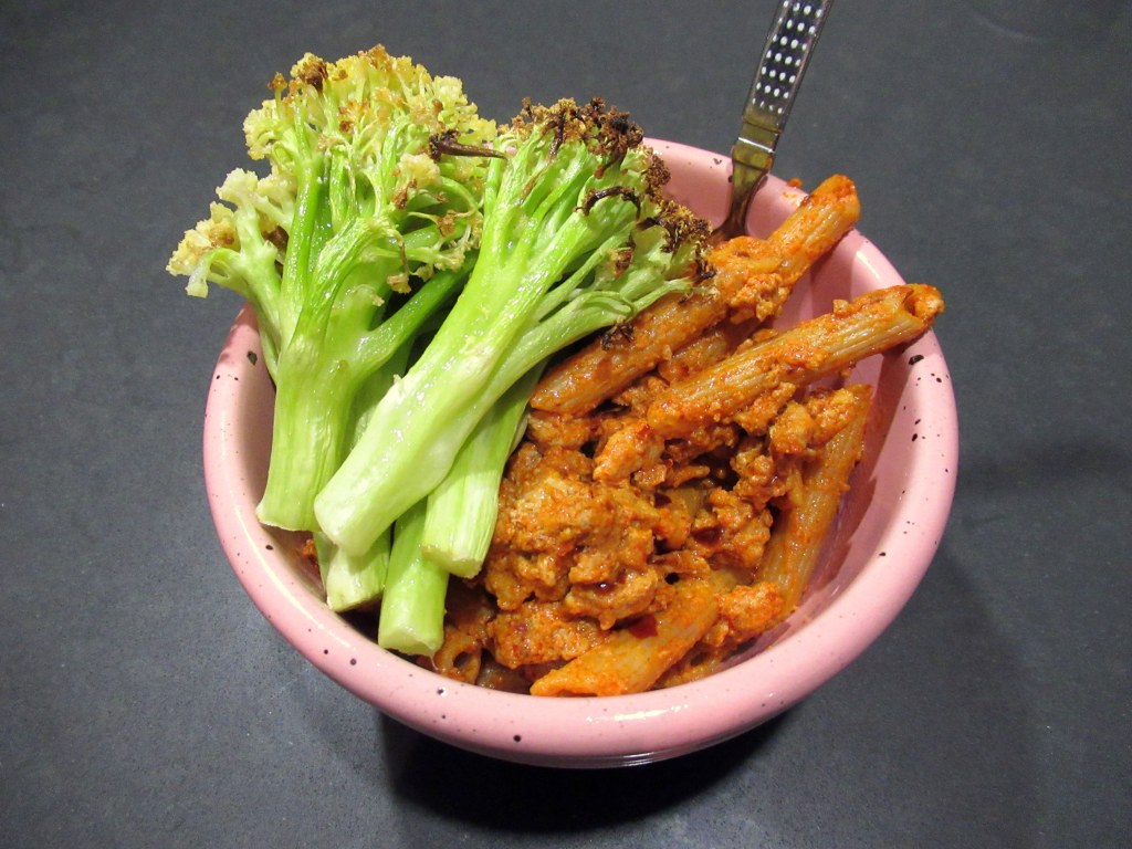 Pumpkin pasta. Whole-wheat rotini with ground turkey cooked with pumpkin puree, sour cream, and chili oil. Plus roasted baby cauliflower.
