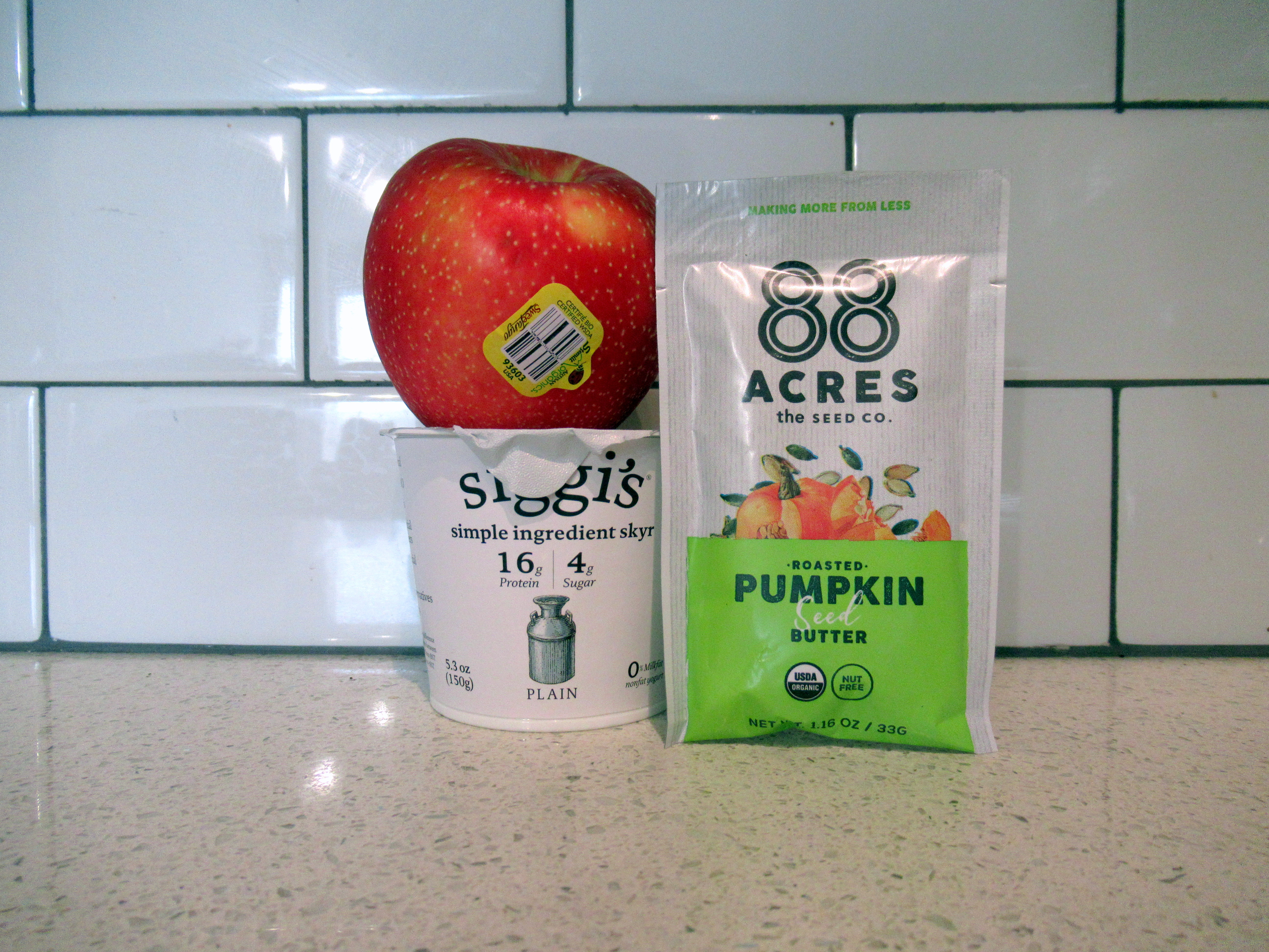 Plan Siggi’s with pumpkin seed butter. Plus an apple and a pumpkin spice chocolate cookie. P.S. This recipe made some of my favorite cookies of all time, so butterscotchy!