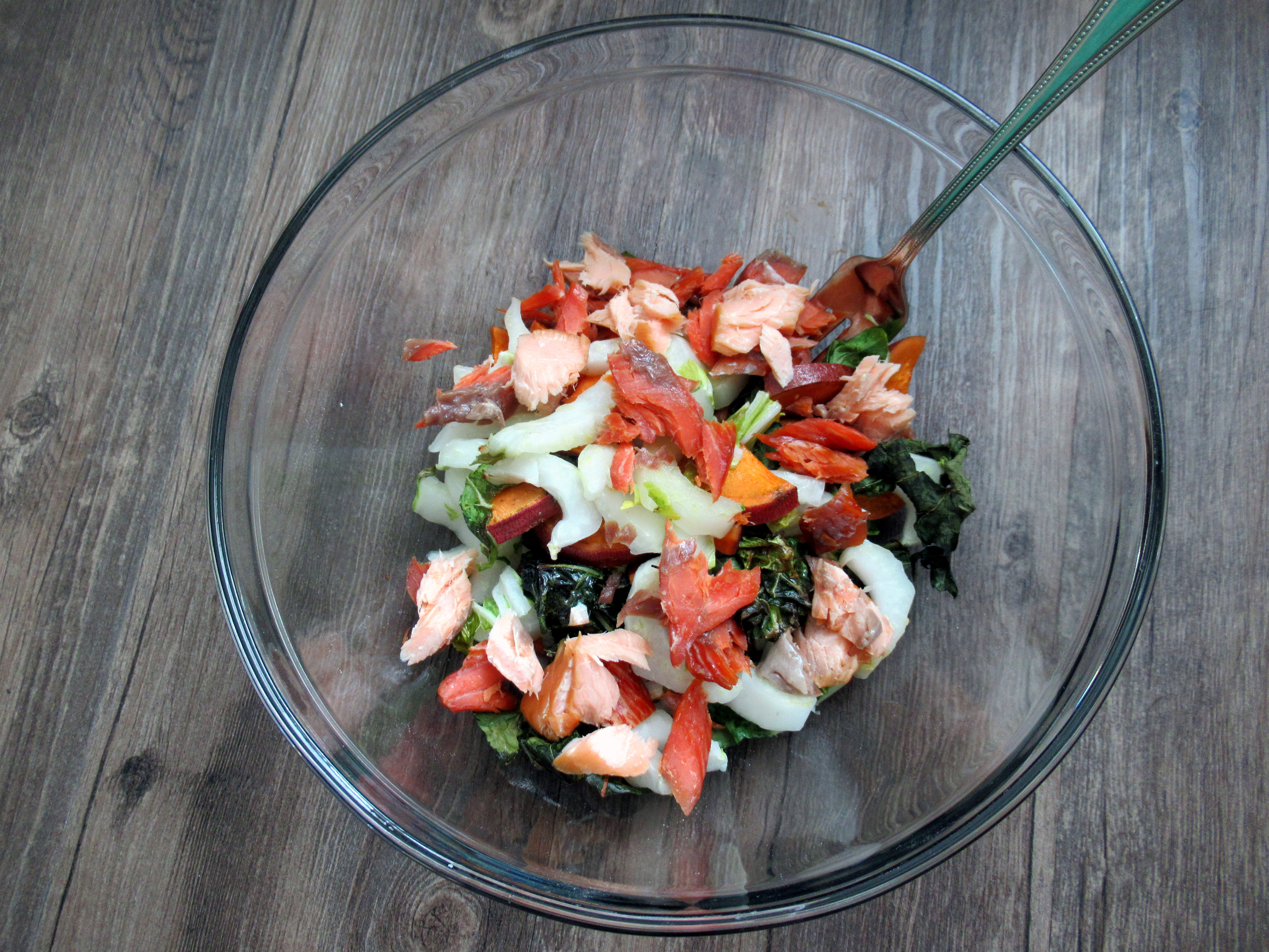 My favorite sheet pan hash combo – roasted bok choy and sweet potato plus smoked salmons (hot smoked Atlantic and salmon candy).