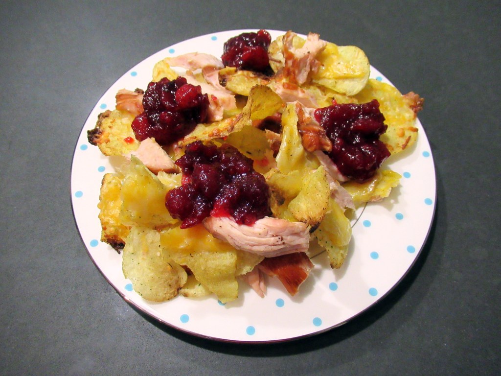Nachos! Stuffing chips with cheese, cranberry sauce, and smoked turkey.