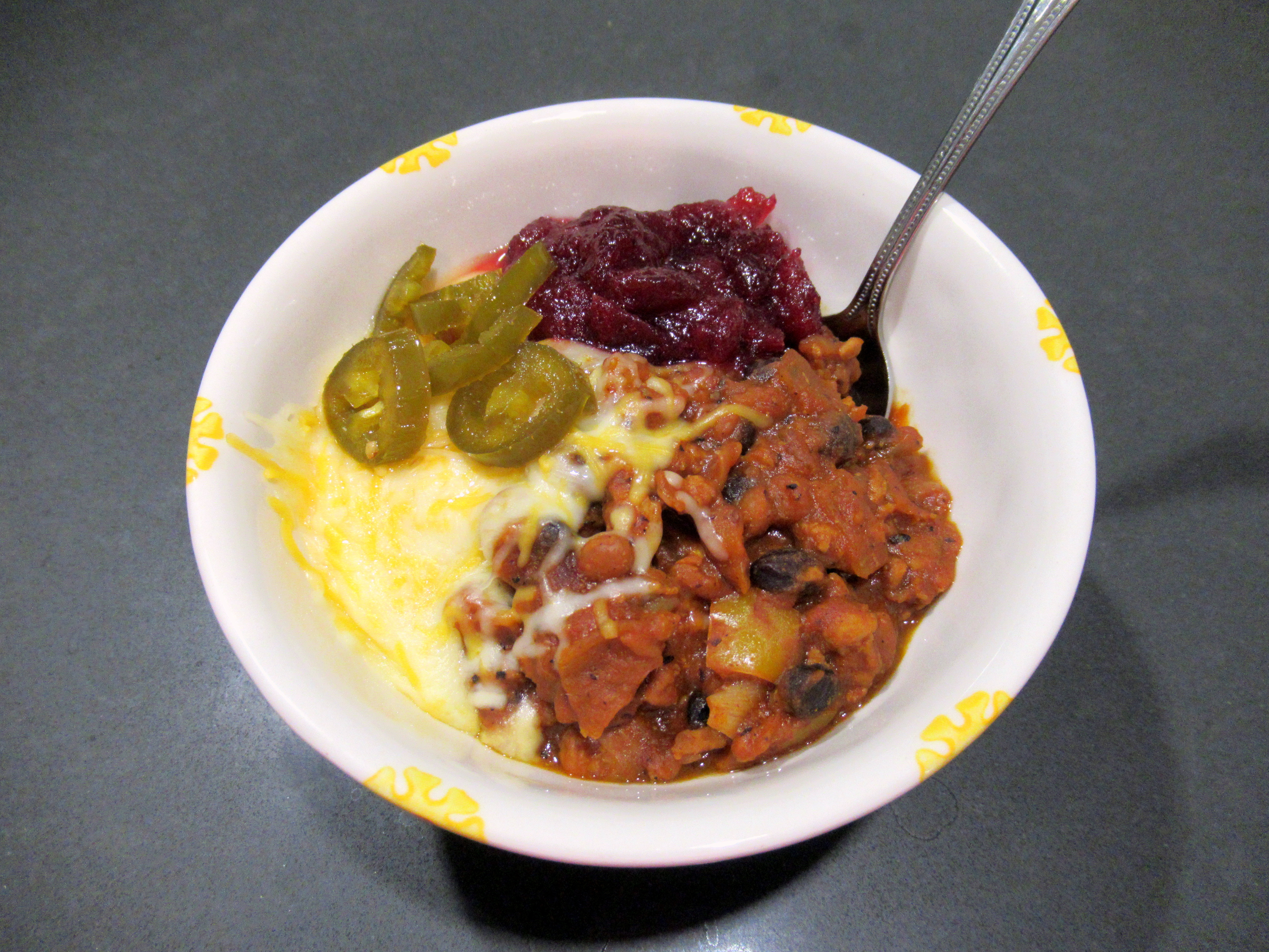 Homemade bbq turkey and black bean chili. Topped with cheese, cranberry sauce, and Trader Joe’s hot and sweet jalapenos.