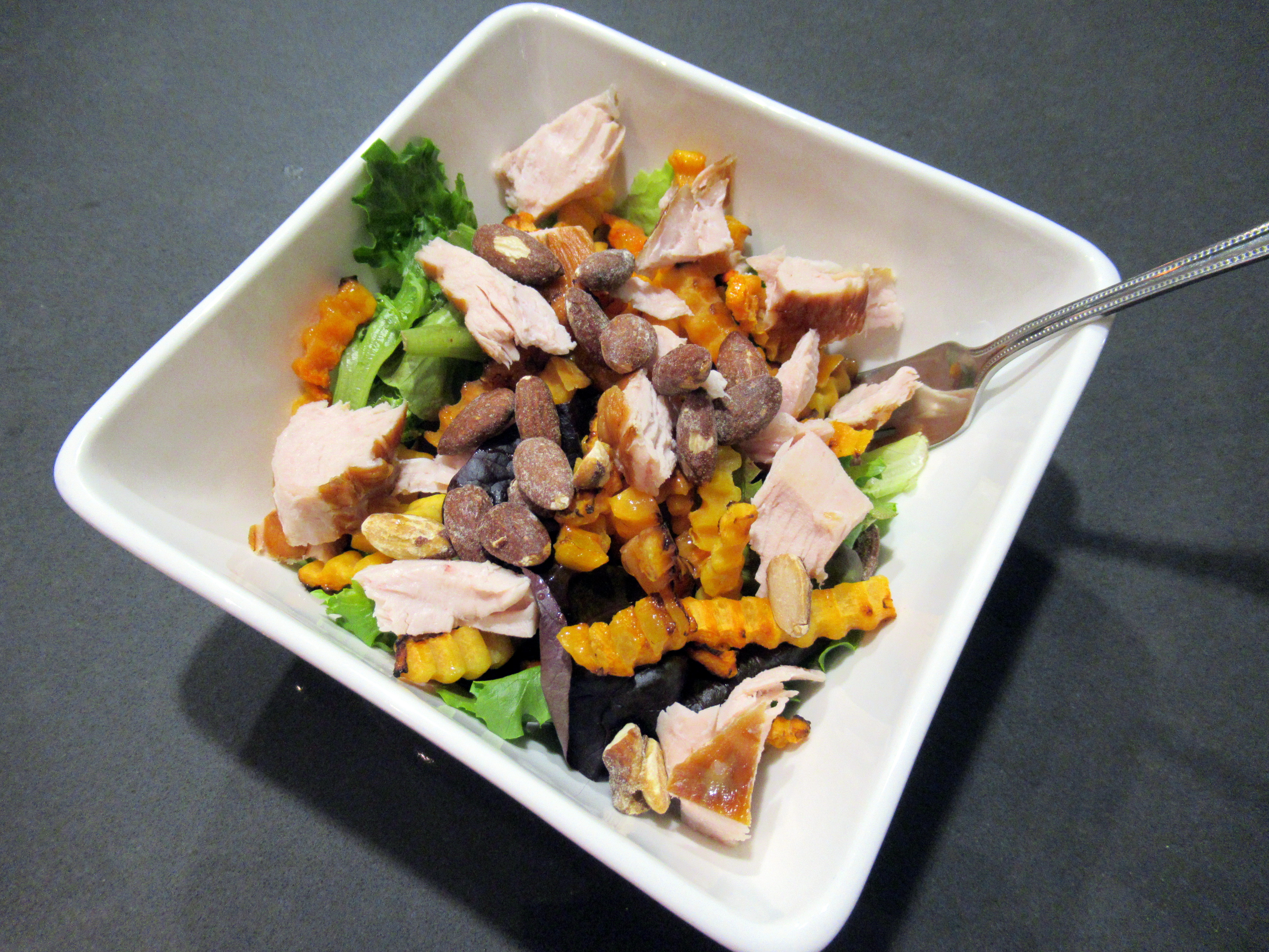Salads. Sweet baby lettuce with black garlic balsamic vinaigrette, Trader Joe’s maple roasted almonds, smoked turkey, and roasted butternut squash.