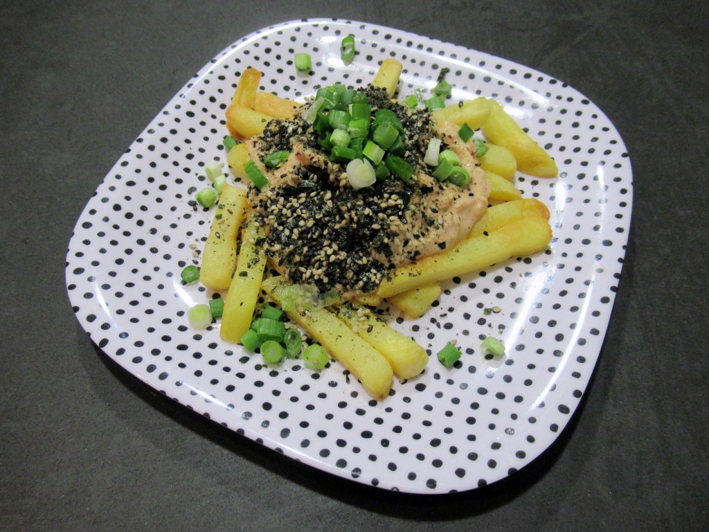 Fries with spicy tuna salad, chili flakes, green onion, and furikake.