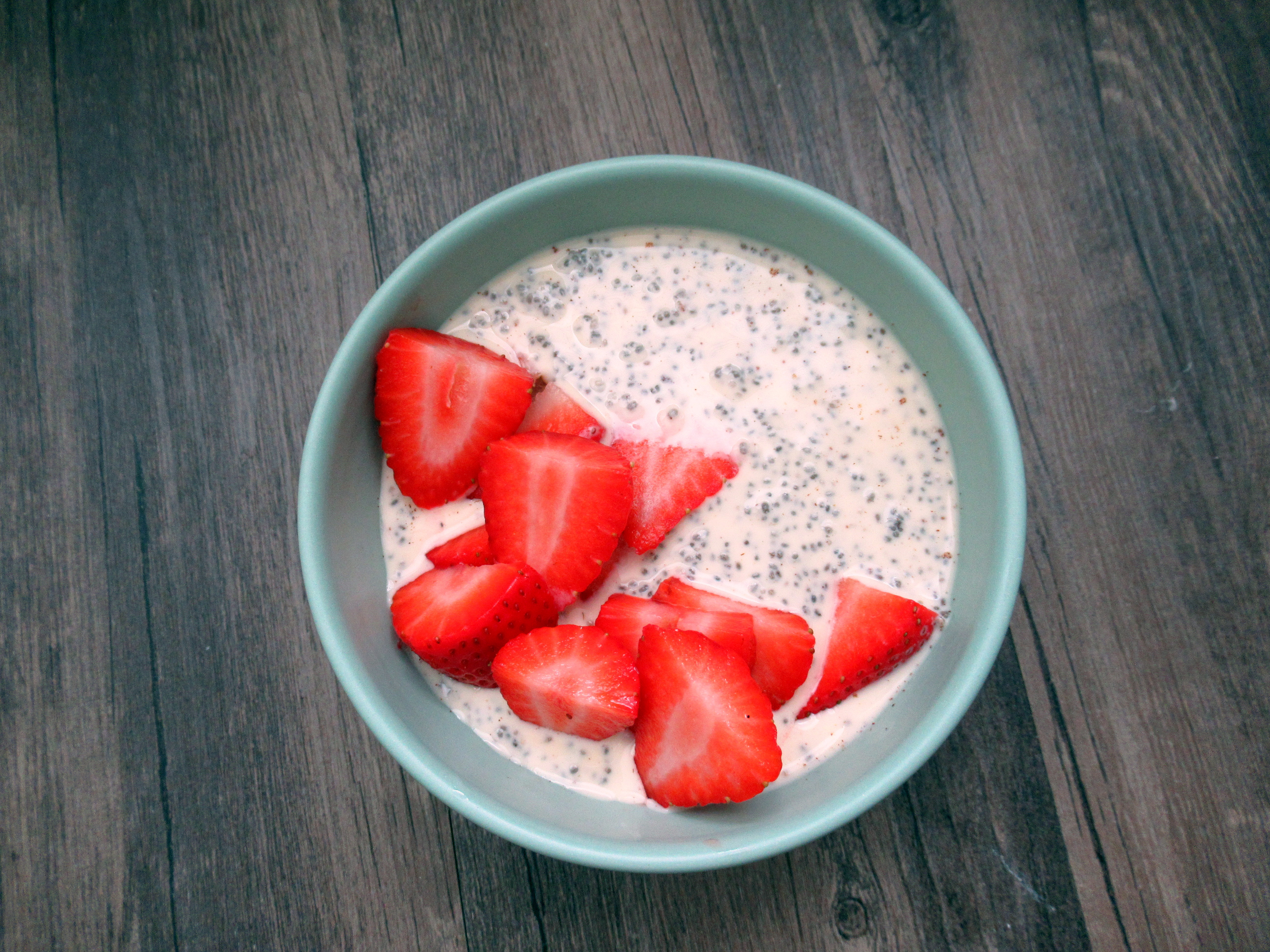 Chia pudding with eggnog and cinnamon and fresh strawberries.