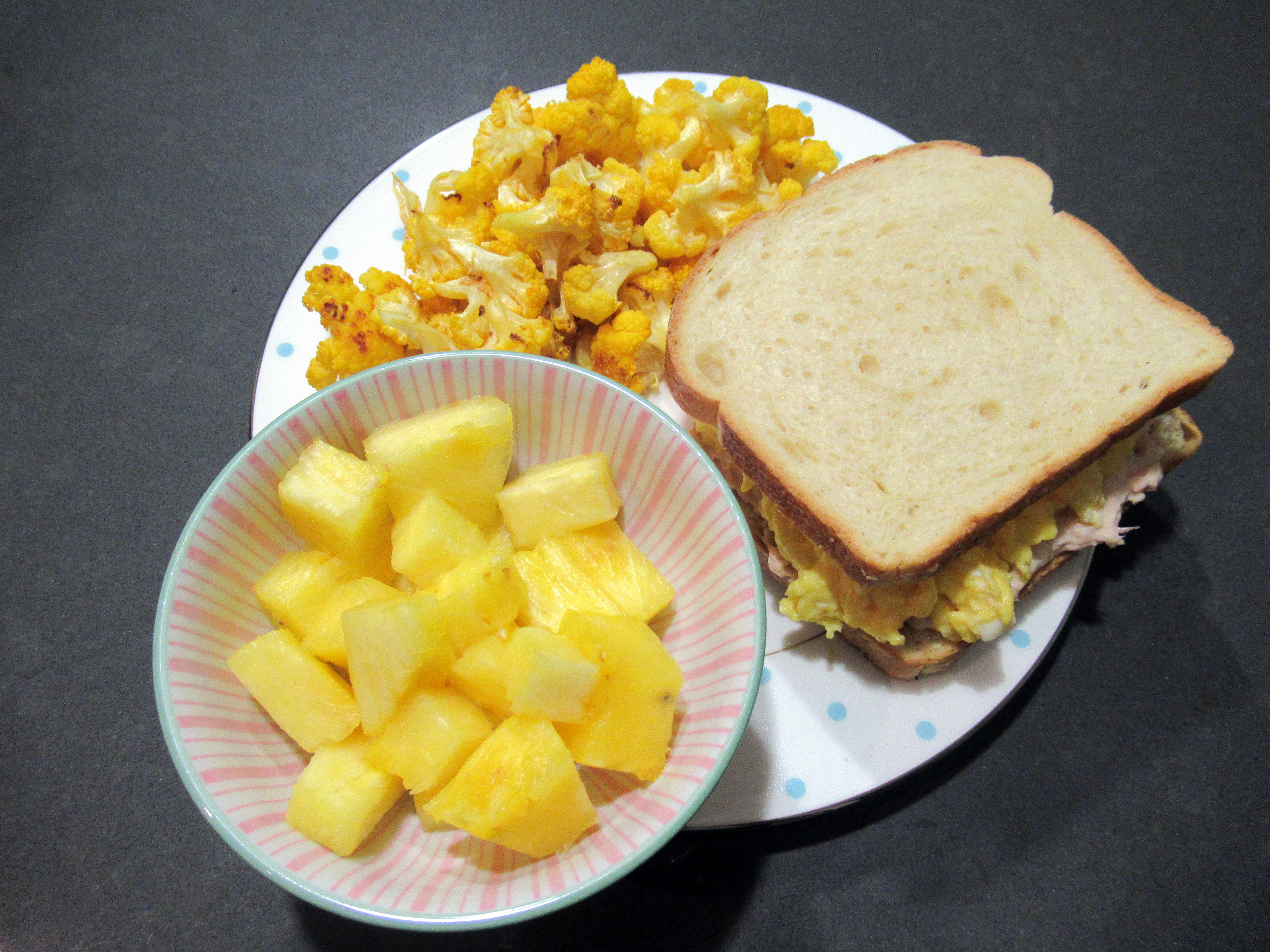 I didn’t mean for this plate to be so yellow, but it was the best meal of the week! Golden pineapple / roasted orange cauliflower / soft scrambled egg sandwich with tons of smoked salmon salad.