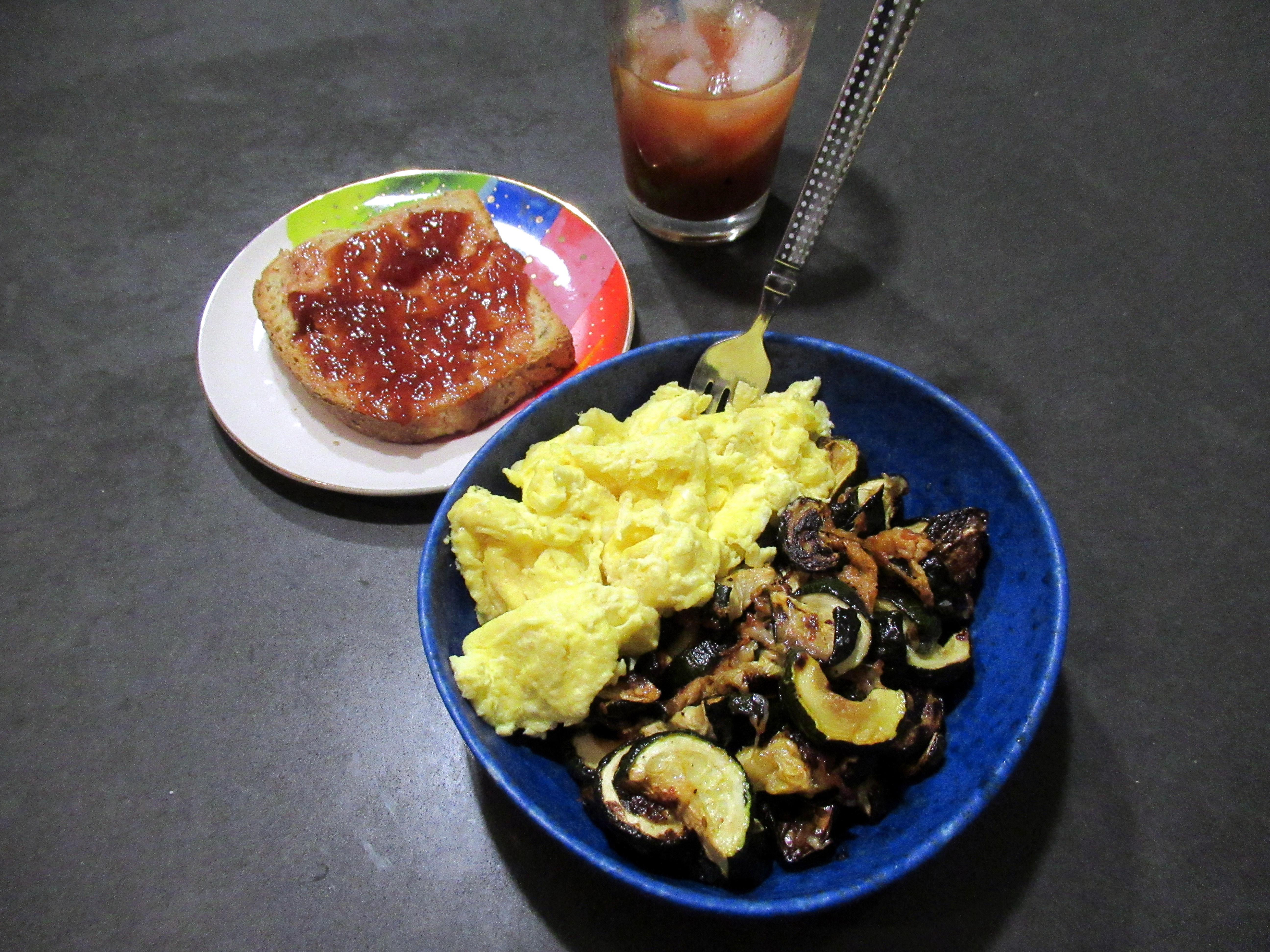 Roasted zucchini with parmesan / soft-scrambled eggs / rye toast with strawberry jam.