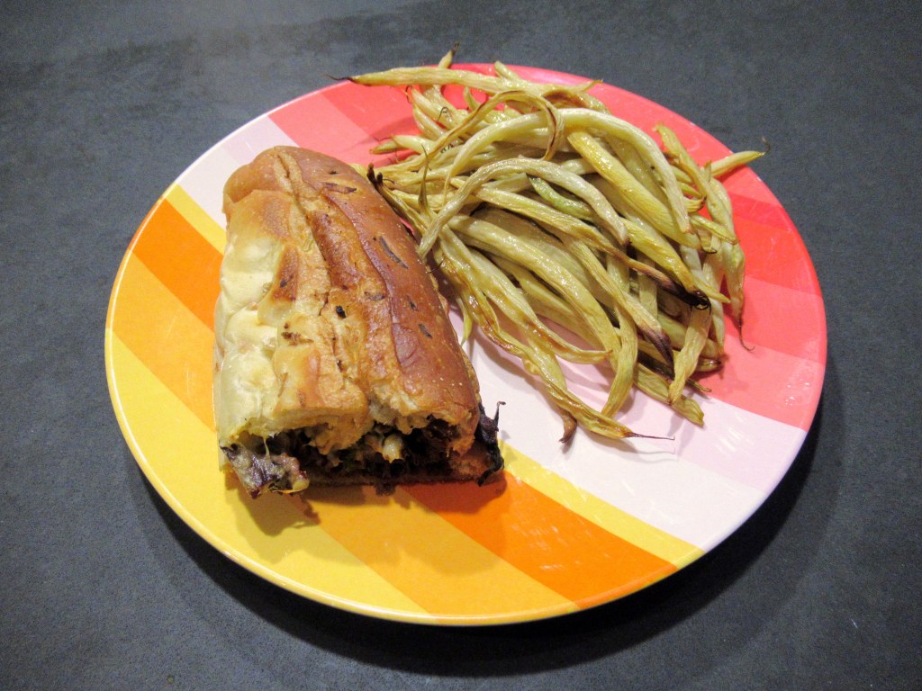 Take-out Philly cheesesteak with roasted yellow French beans.