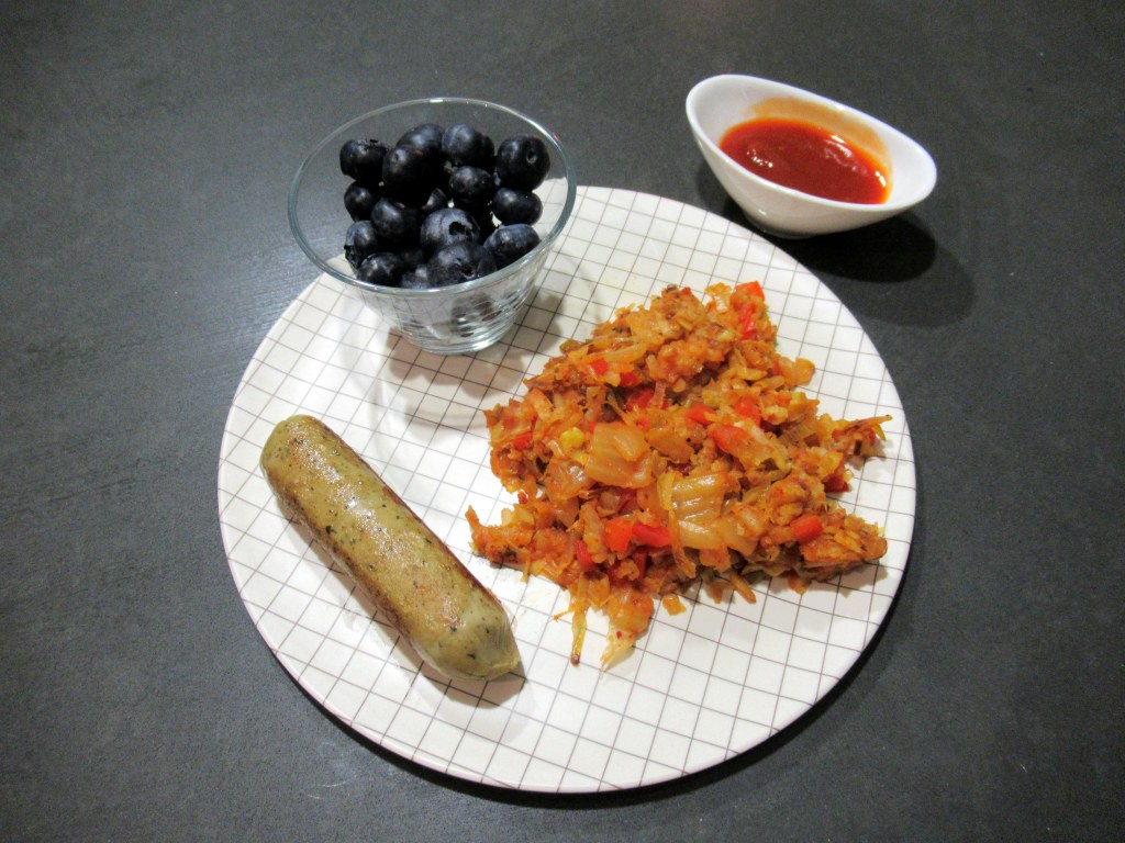 Seemore’s chicken, kale, and pesto sausage / jumbo blueberries / hash with shredded potato, leek, red pepper, and kimchi / ketchup + Sriracha.