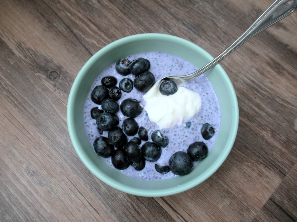 Taro milk chia pudding with honey Chobani yogurt and jumbo blueberries.