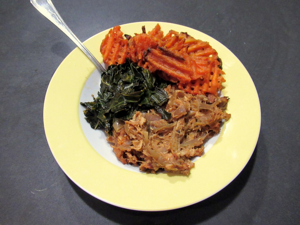 BBQ chicken bowls. Sweet potato fries // sautéed collard greens with butter and lemon // chicken breast and red onion cooked in the crock pot, shredded, tossed with bbq sauce, then baked in the oven.
