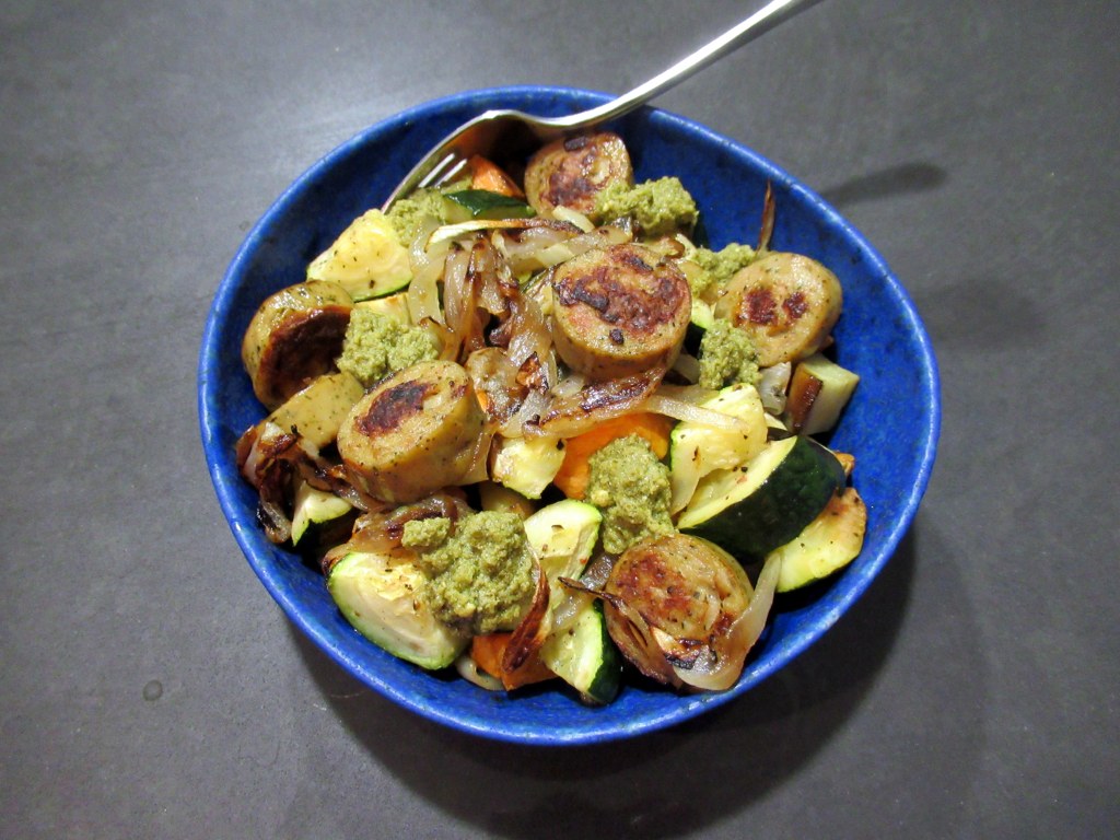 Roasted sheet-pan hash. Pesto chicken sausage, sweet potato, Japanese sweet potato, zucchini, fennel, and sweet onion; topped with pesto. <– this was 11/10 and I really want to make a Super Bowl joke about it