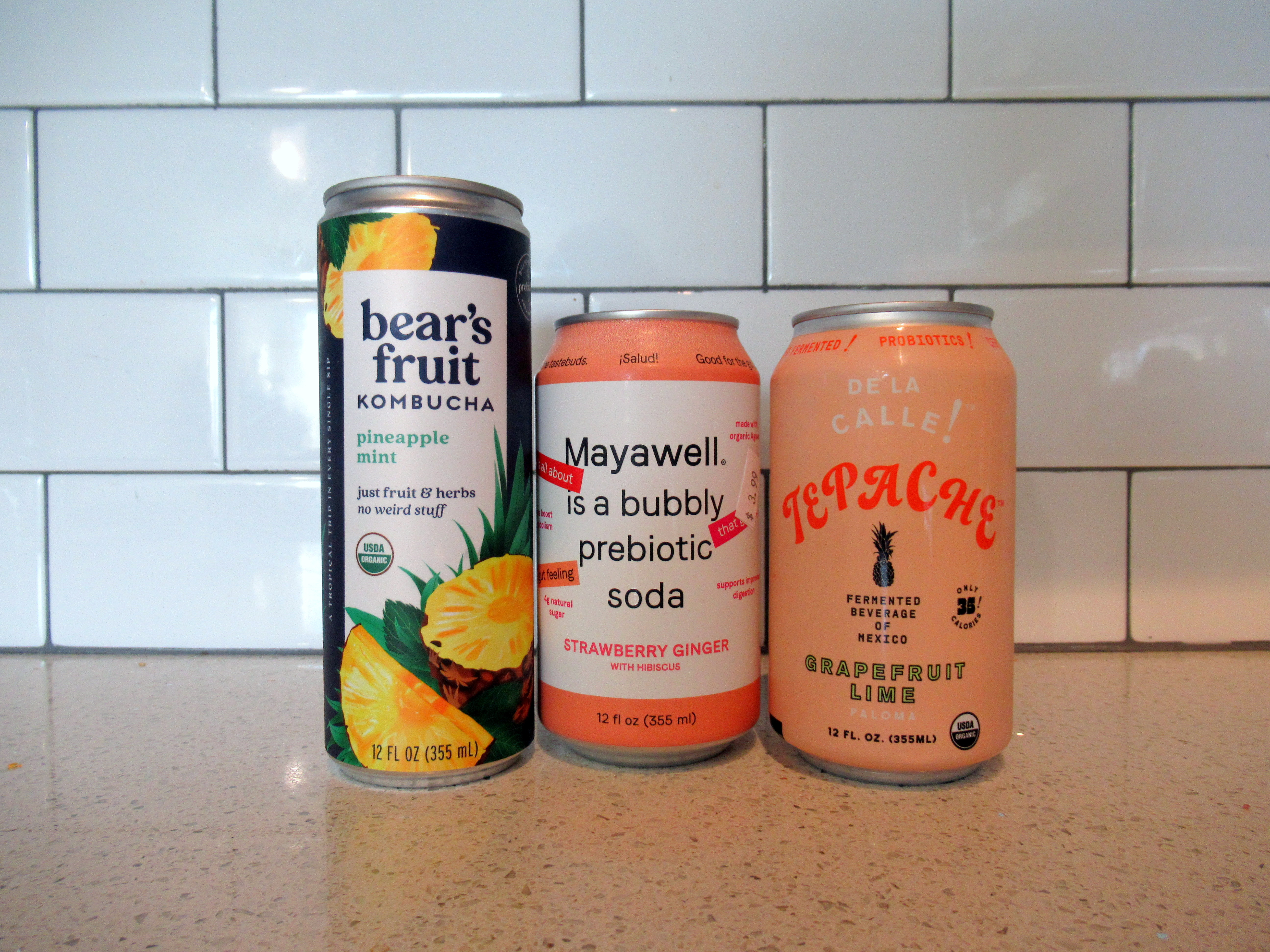 This week’s fizzy, fermented drink line up. Pineapple mint kombucha (too sweet – I prefer other flavors from this brand) / strawberry ginger prebiotic soda (too ginger spicy) / grapefruit lime tepache (just right!).