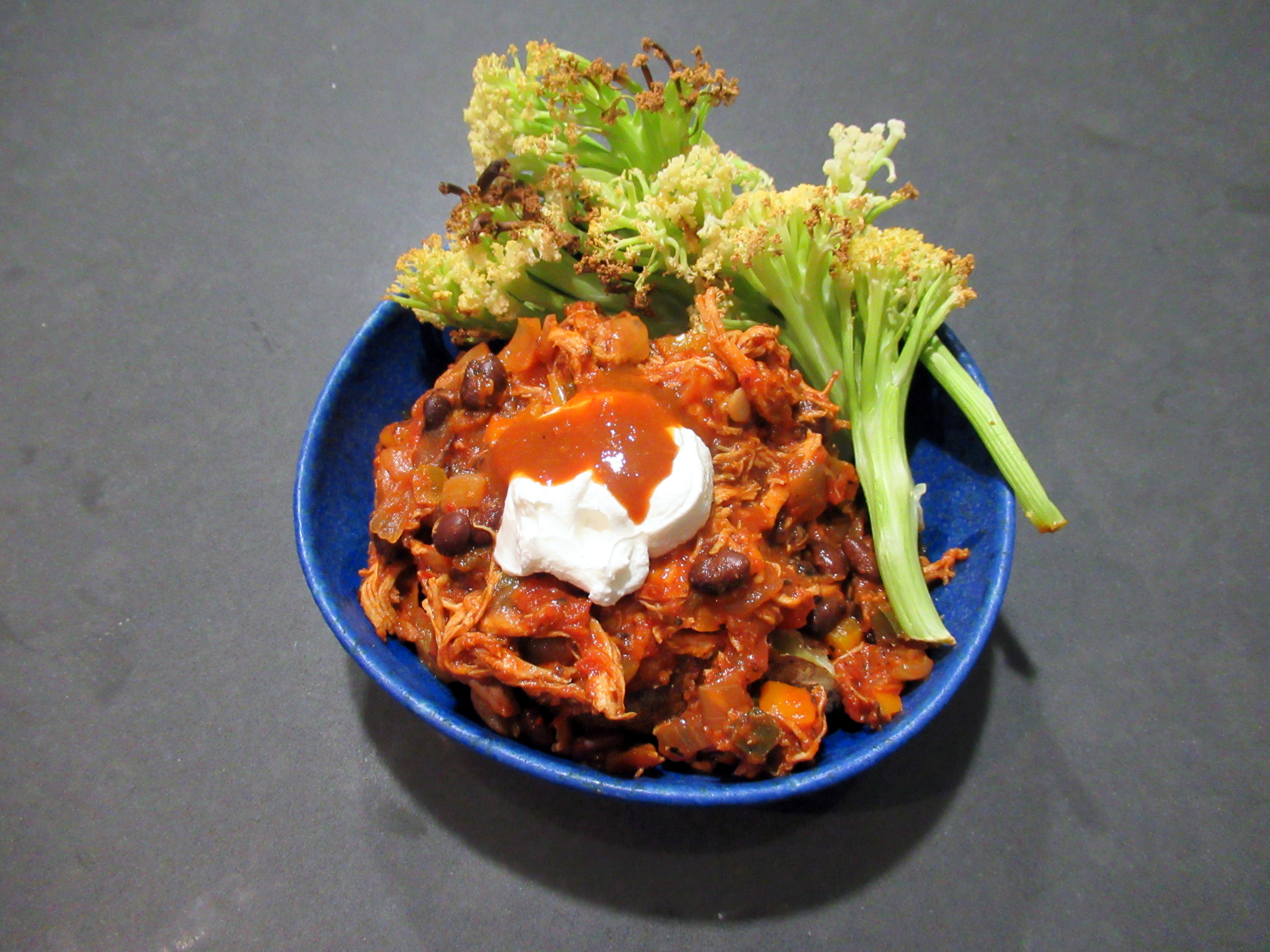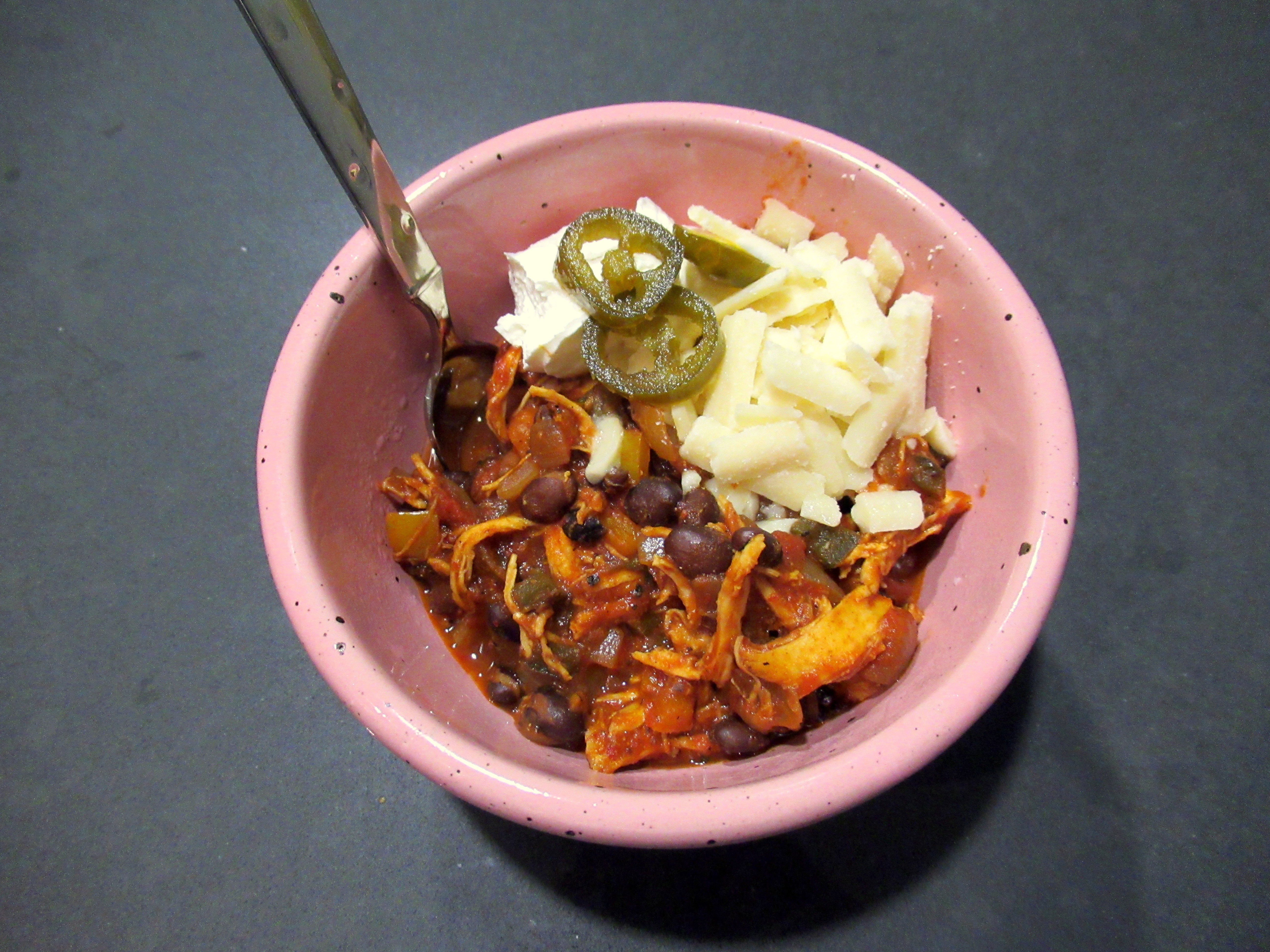 We made a batch of simple but tasty chili with black beans and shredded chicken. Topped with sour cream, TJ’s sweet and spicy jalapenos, and sharp cheddar.