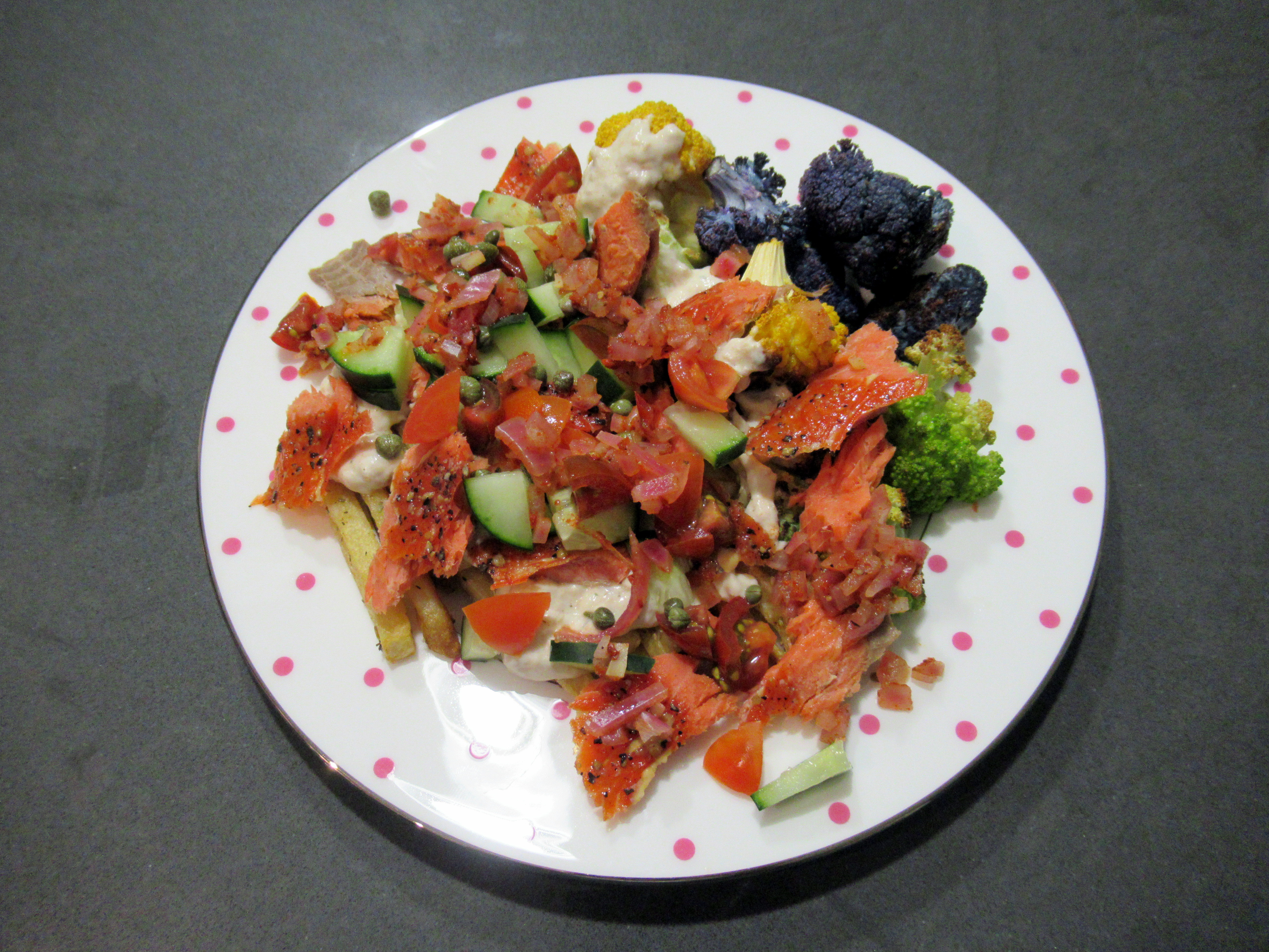 In my ongoing quest to turn every dish into fries and/or nachos – bagels with lox. This was fries and roasted cauliflower topped with TJ’s smoked salmon dip, hot smoked salmon, capers, quick pickled red onion, and chopped cucumber and tomato.