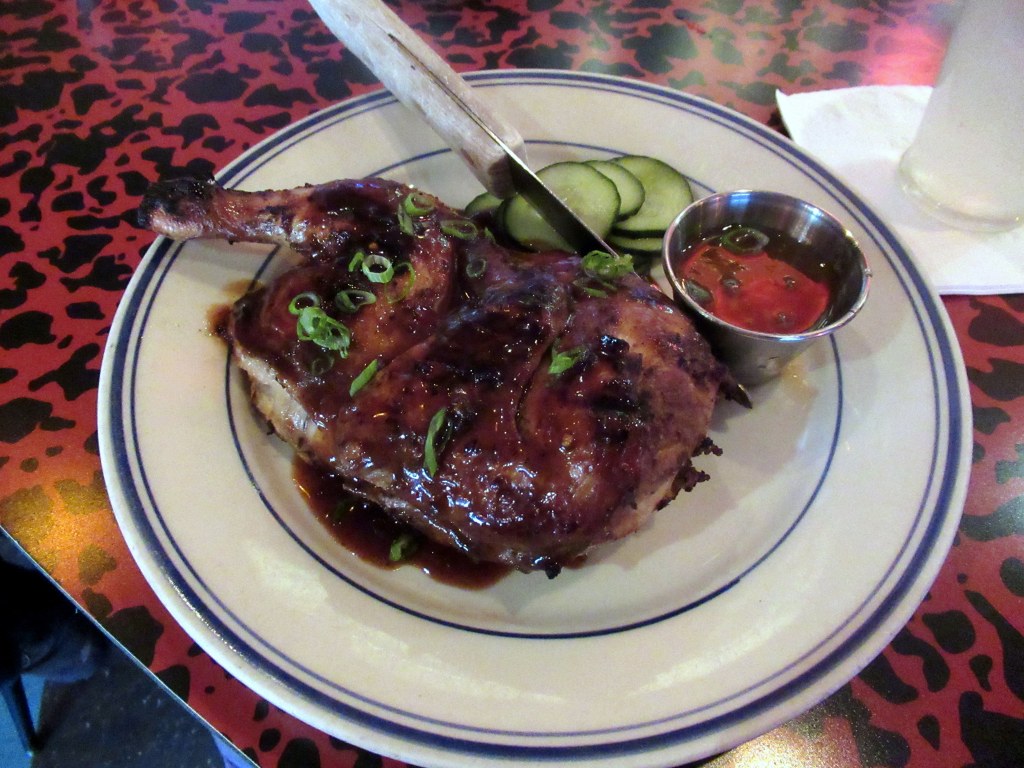Miss Lilly‘s jerk chicken was so juicy! With rice and peas and mango chutney.