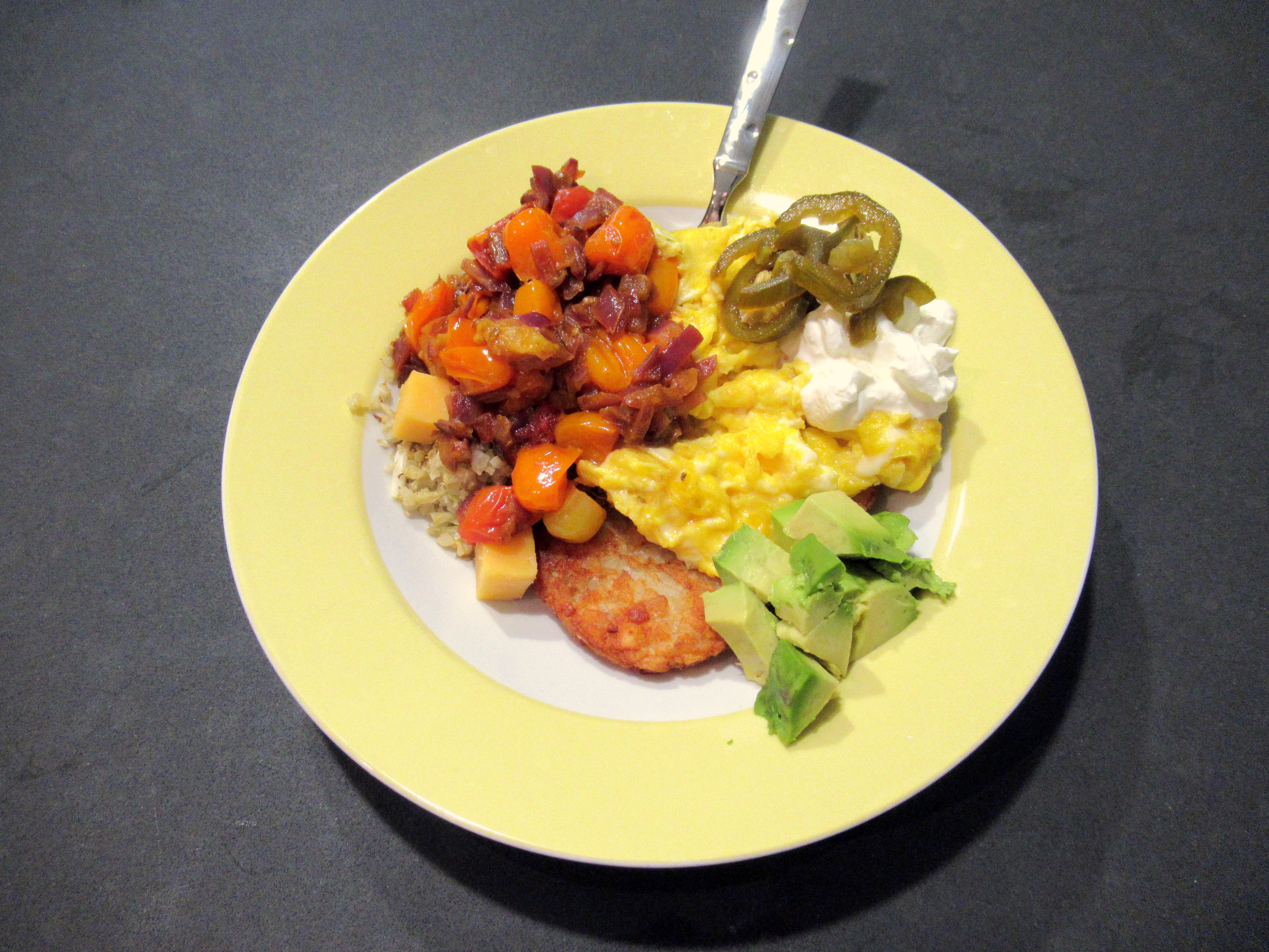 We made great breakfast for dinner bowls. Hashbrowns, roasted riced cauliflower, soft-scrambled eggs, avocado, heirloom tomatoes and red onion sautéed with butter, sharp cheddar, sour cream, and sweet and spicy jalapenos.