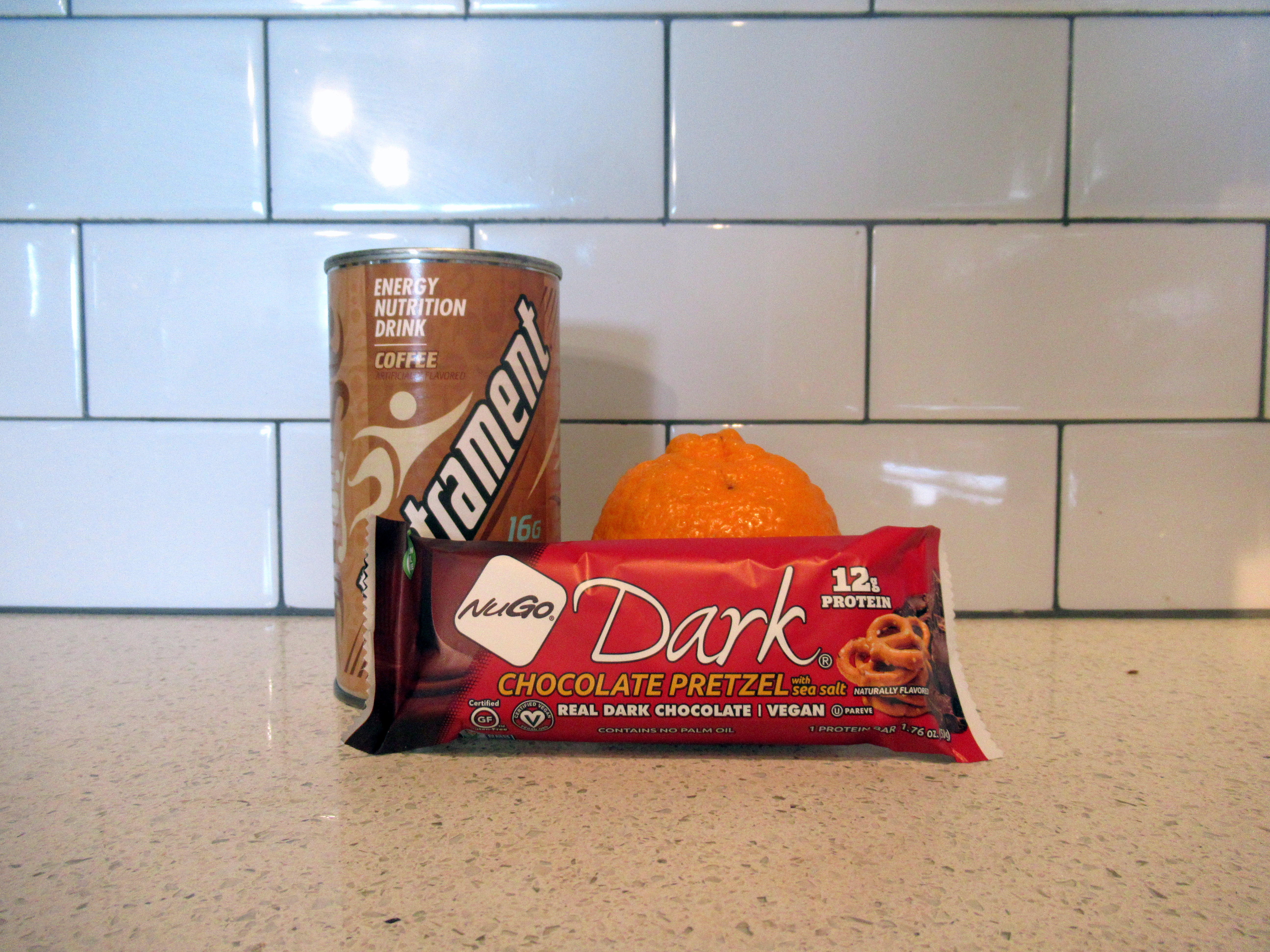 Aggressively eclectic work brunch snacks. Coffee Nutrament / chocolate pretzel bar / golden nugget mandarin.