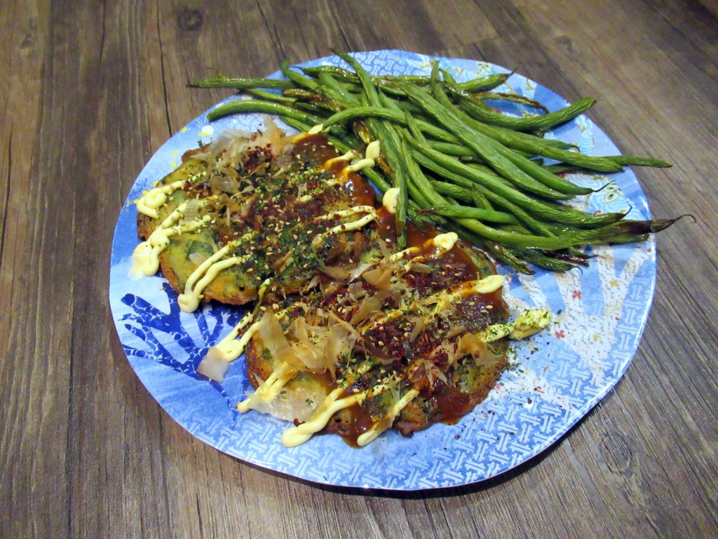 Loaded Trader Joe’s scallion pancakes plus roasted green beans. With hoisin, Kewpie, furikake, Korean chili flakes, and bonito.