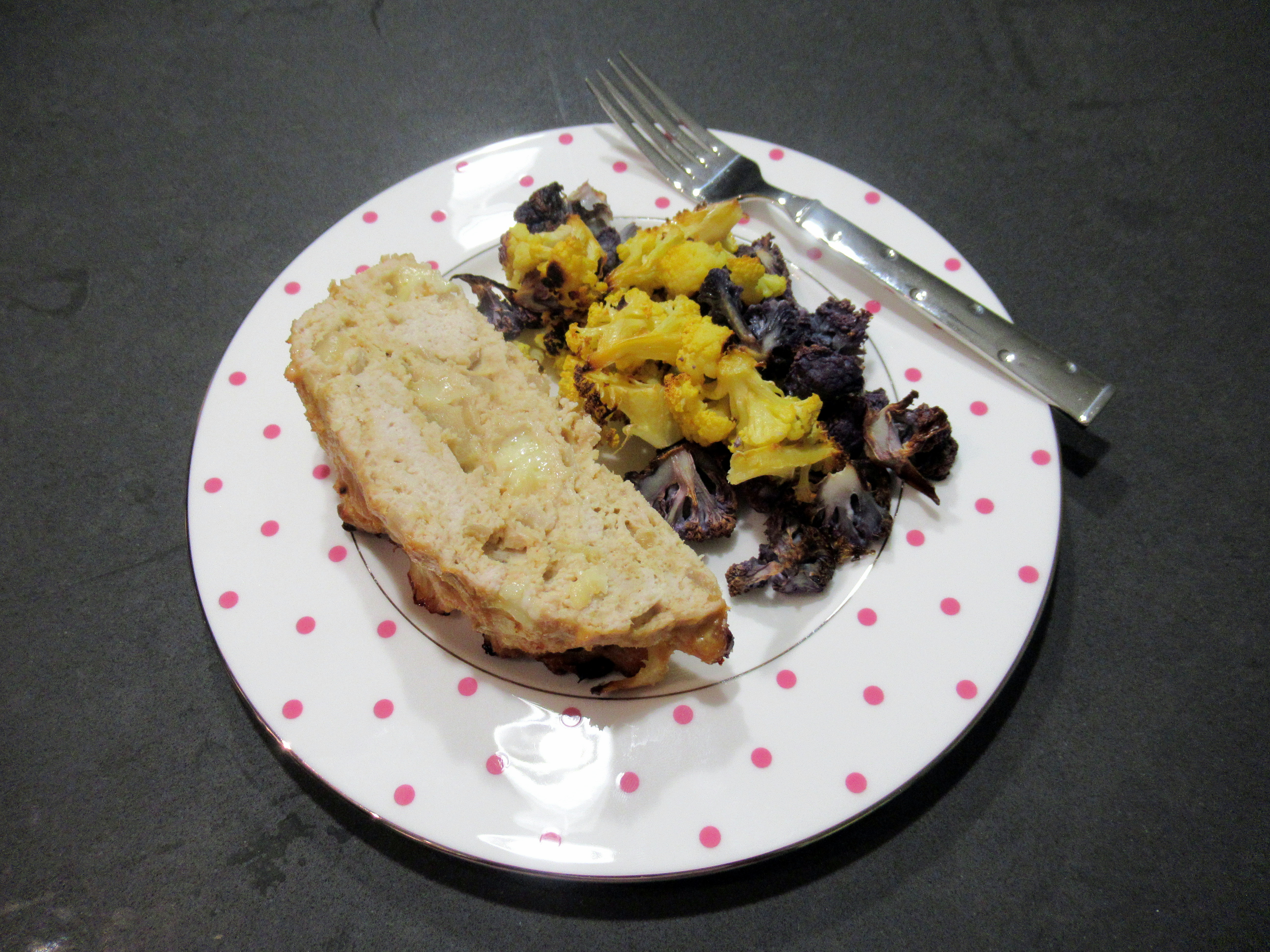 Insanely good turkey meatloaf seasoned with hoisin sauce, cheddar cubes, and roasted sweet onion. Plus roasted purple and orange cauliflower.