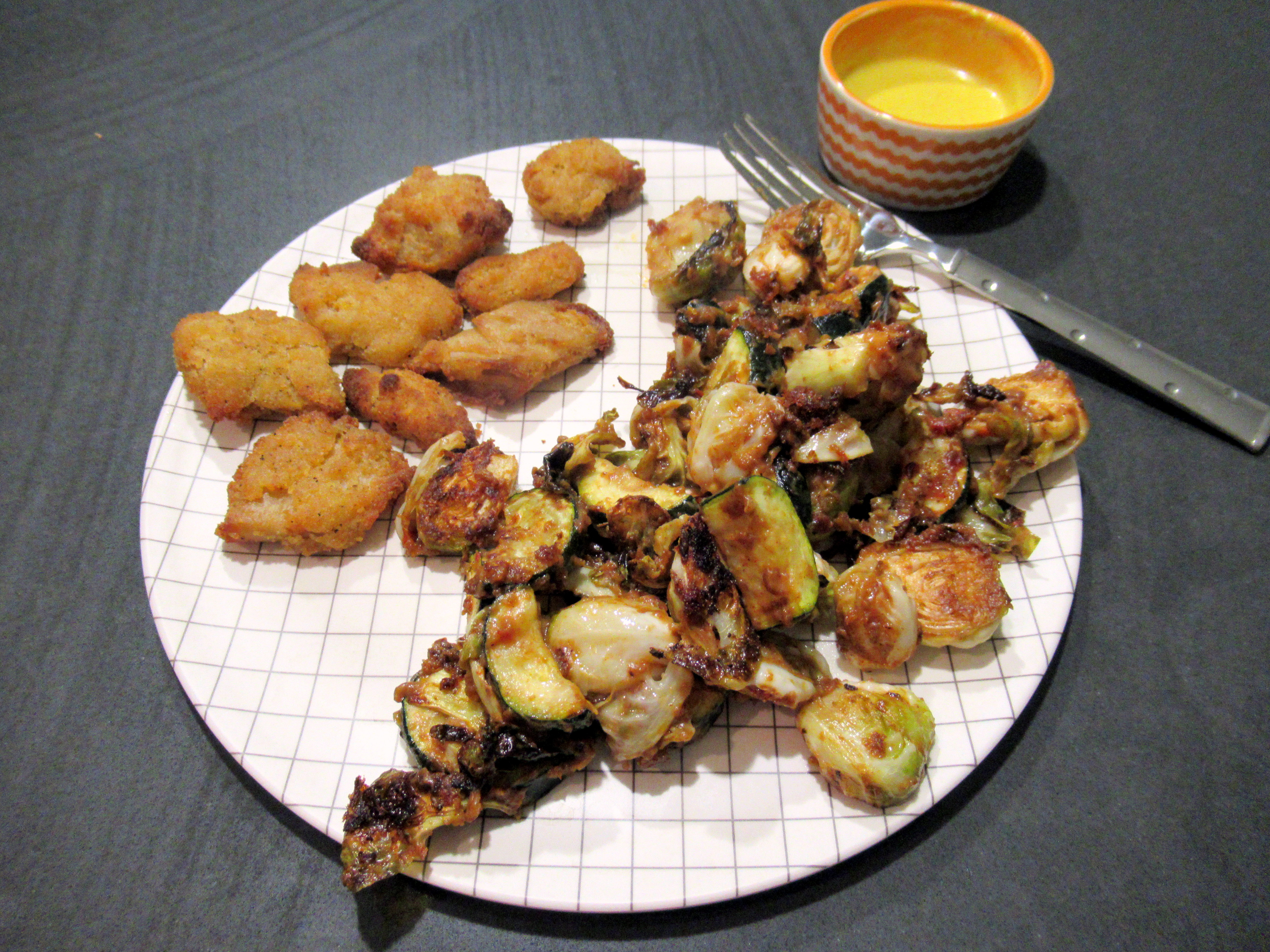 Daring vegan chicken nuggets (10/10!) / roasted zucchini and brussel sprouts sautéed with a spicy black bean and nut butter sauce / homemade honey mustard.