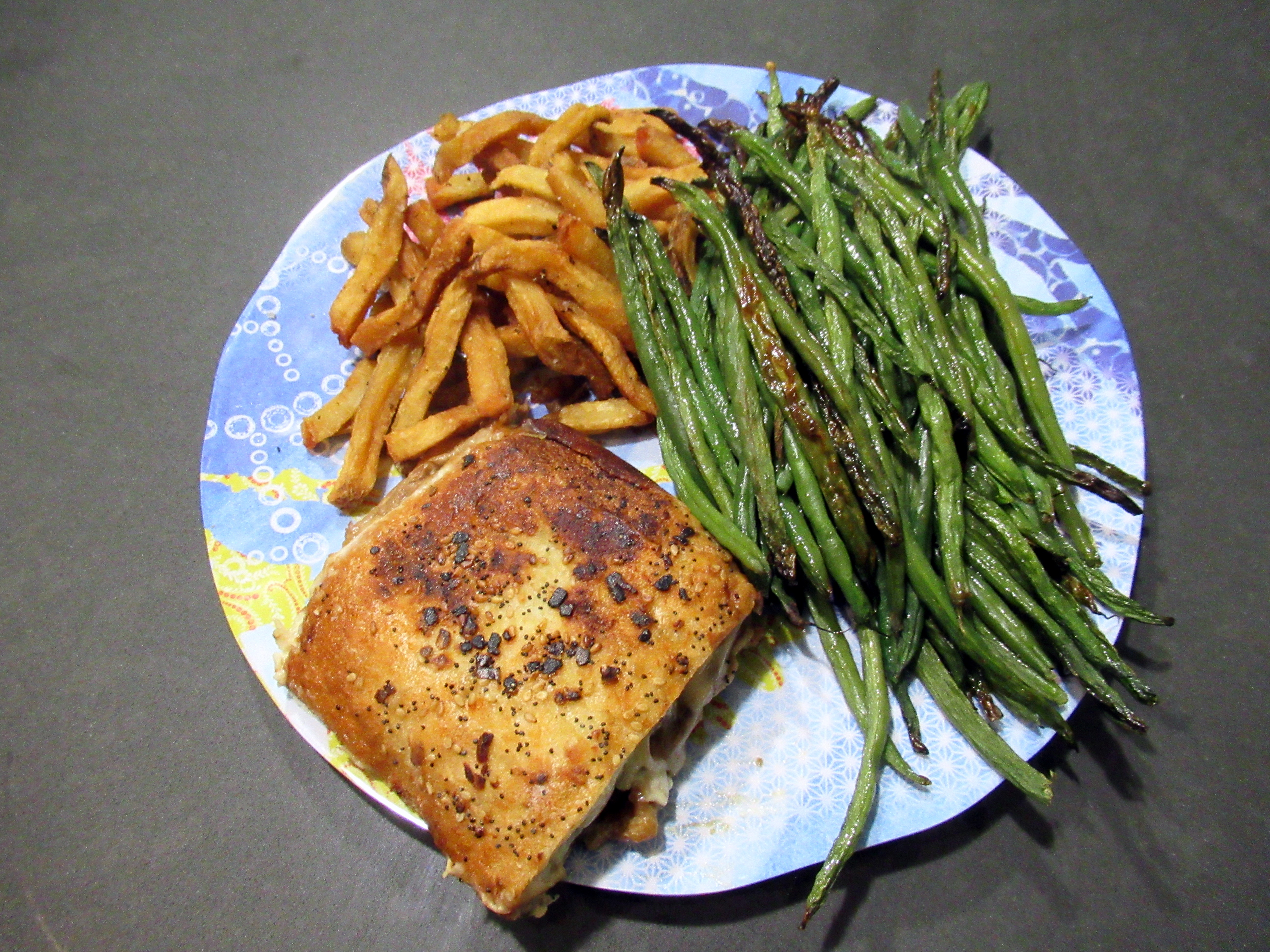 Take-out from Roast – aka our ultimate sandwich experience. Their roast beef melt is my all-time favorite. With fries and roasted green beans.