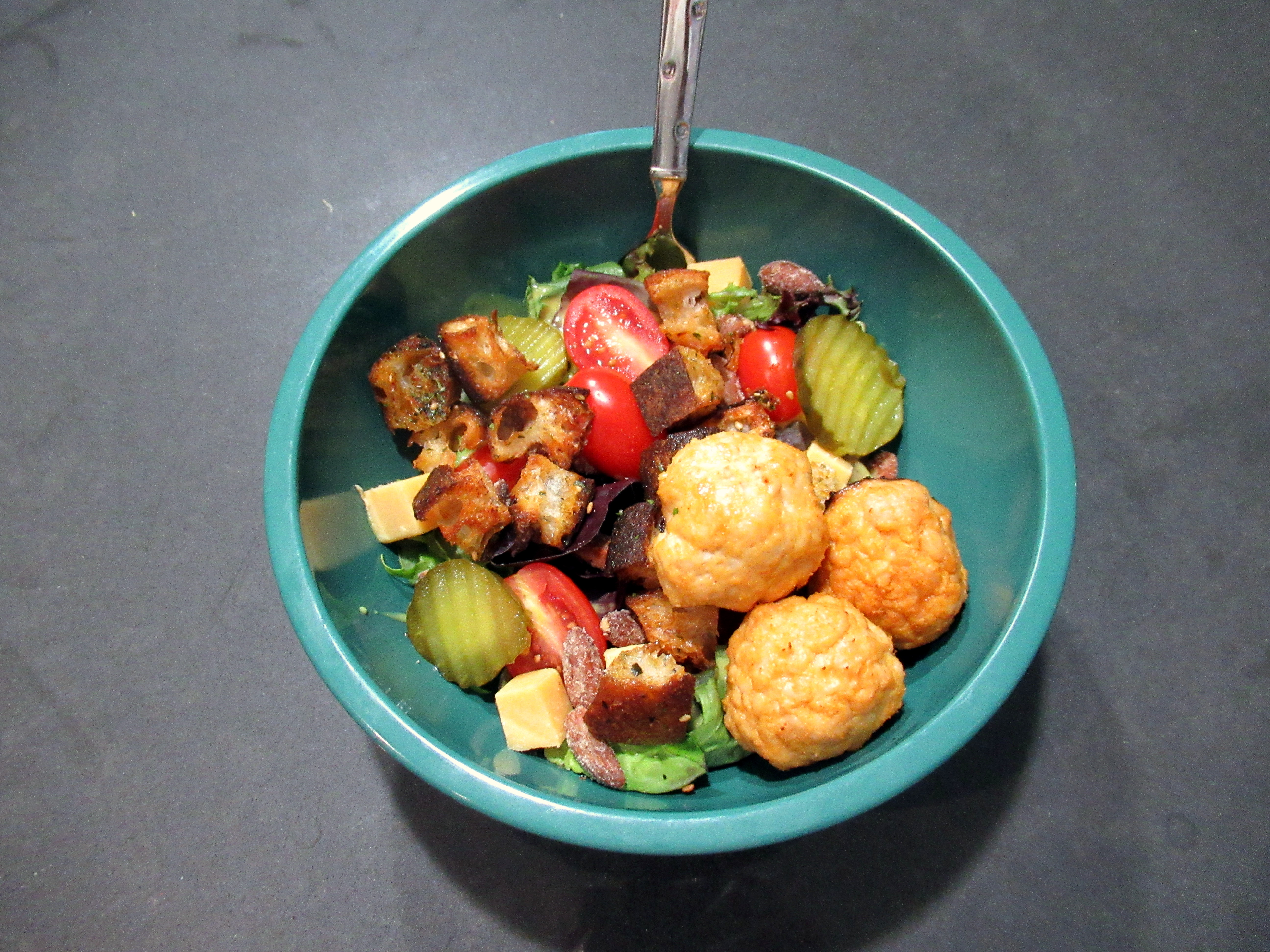 Turkey cheeseburger-inspired salad. Local lettuce with honey mustard dressing, baby tomatoes, dill pickle almonds, dill pickle slices, turkey meatballs (seasoned with dill pickle juice and yellow mustard), sharp cheddar, and homemade croutons with furikake.