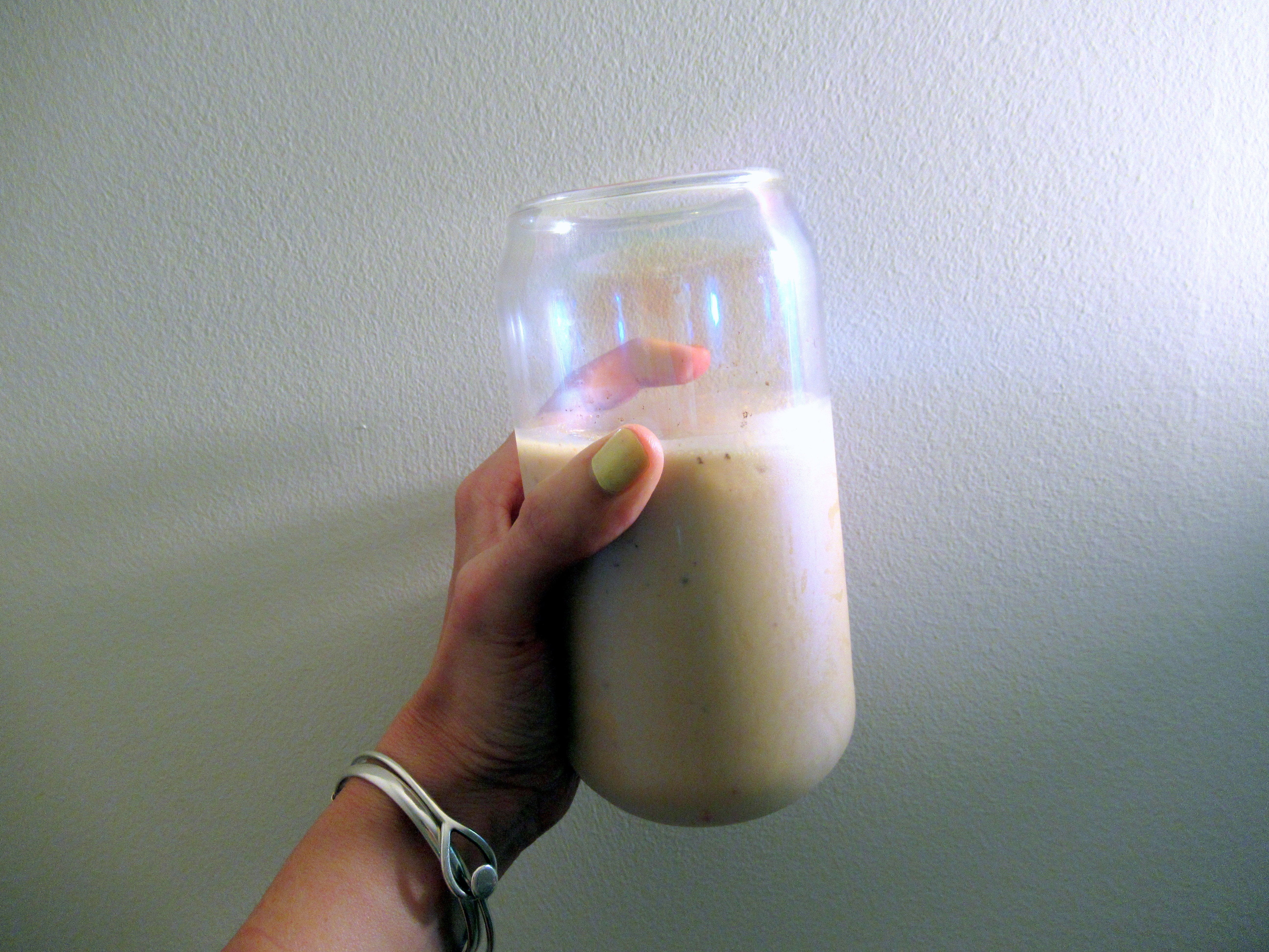 Fluffernutter dessert smoothie. Plain Greek yogurt, almond milk, frozen banana, peanut butter, and toasted marshmallows.