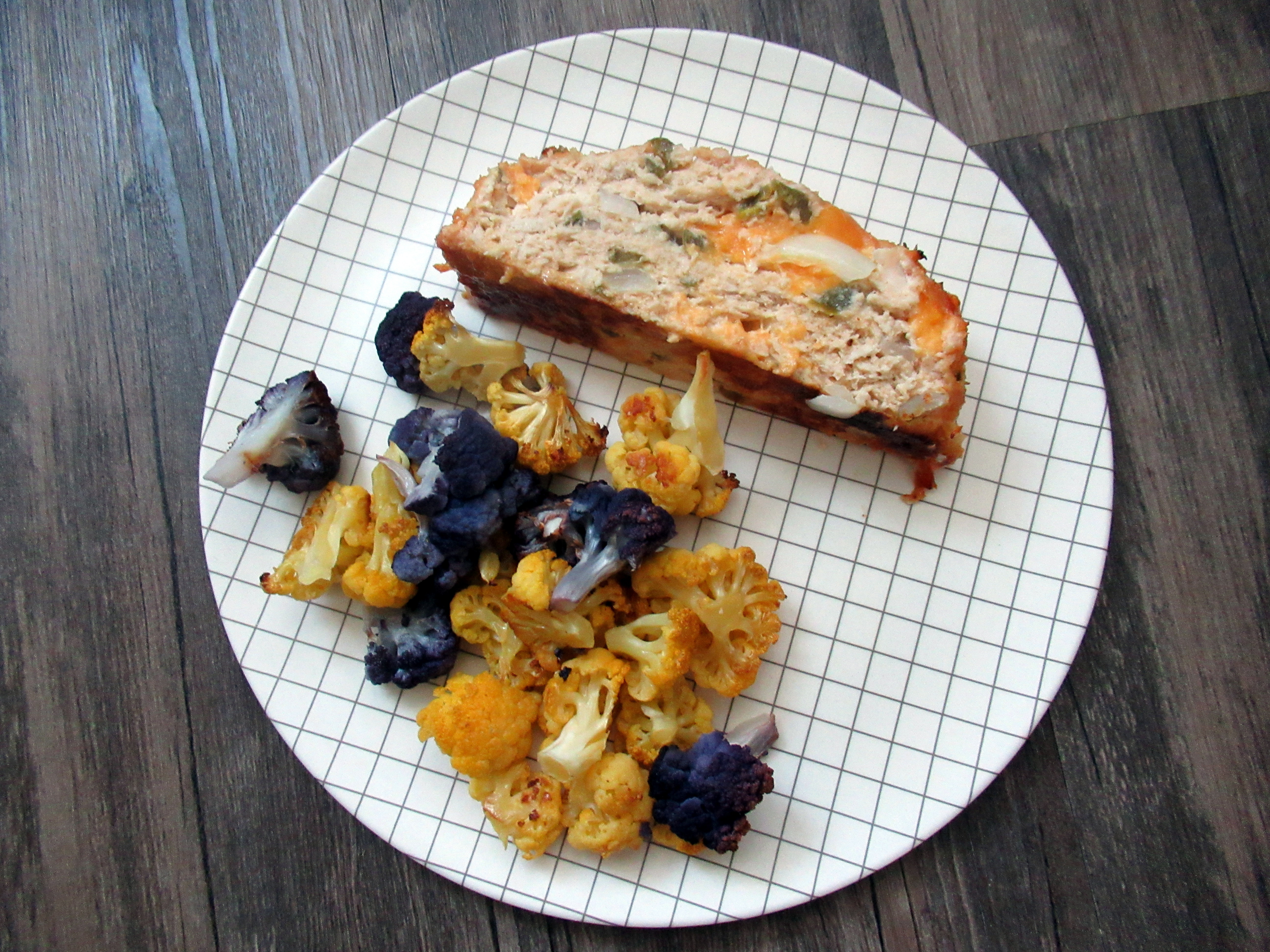 I made jalopeno popper turkey meatloaf! It was amazing and Adam and I both went back for seconds. Ground turkey, panko bread crumbs, ketchup, diced pickled jalopenos, jalopeno juice, chopped white onion, egg, and diced sharp cheddar. With roasted orange and purple cauliflower on the side.