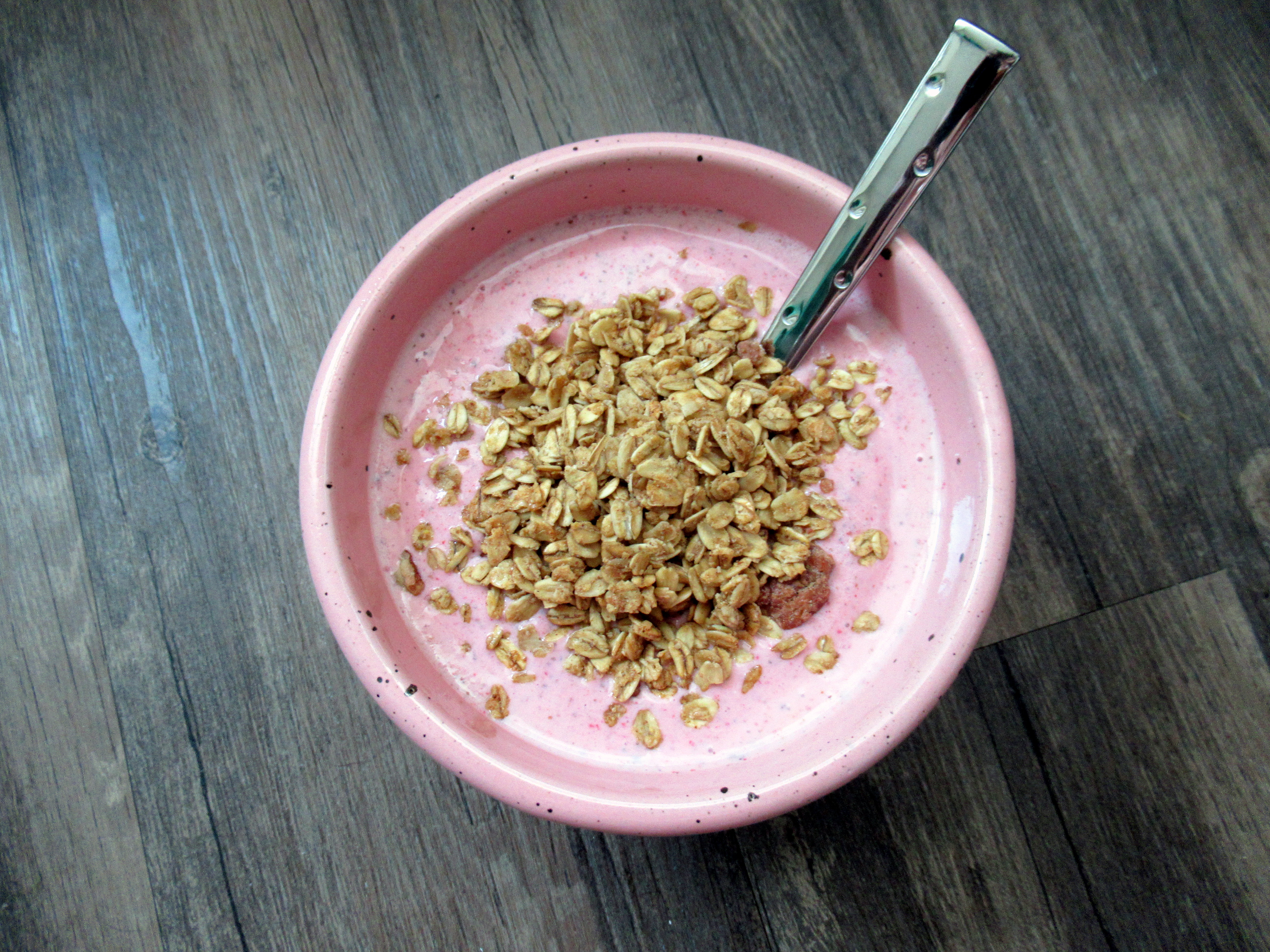 Strawberry cheesecake smoothie bowl! Plain Greek yogurt, almond milk, cream cheese, brown sugar, chia seeds, and frozen strawberries; topped with maple pecan granola.
