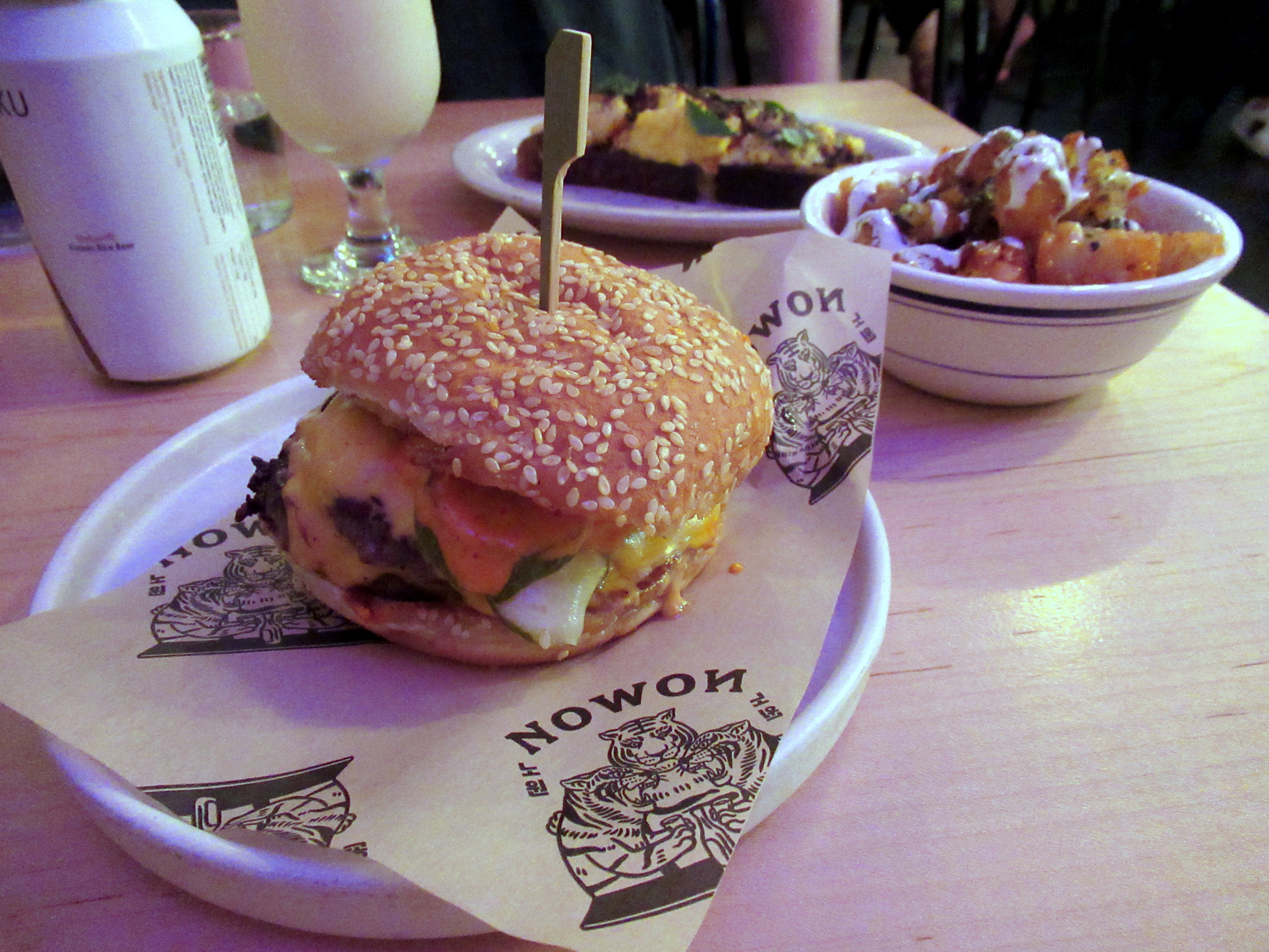 My favorite cheeseburger – double smashed patties, American cheese, kimchi mayo, bread and butter pickles. Plus ridiculously amazing honey butter tots.