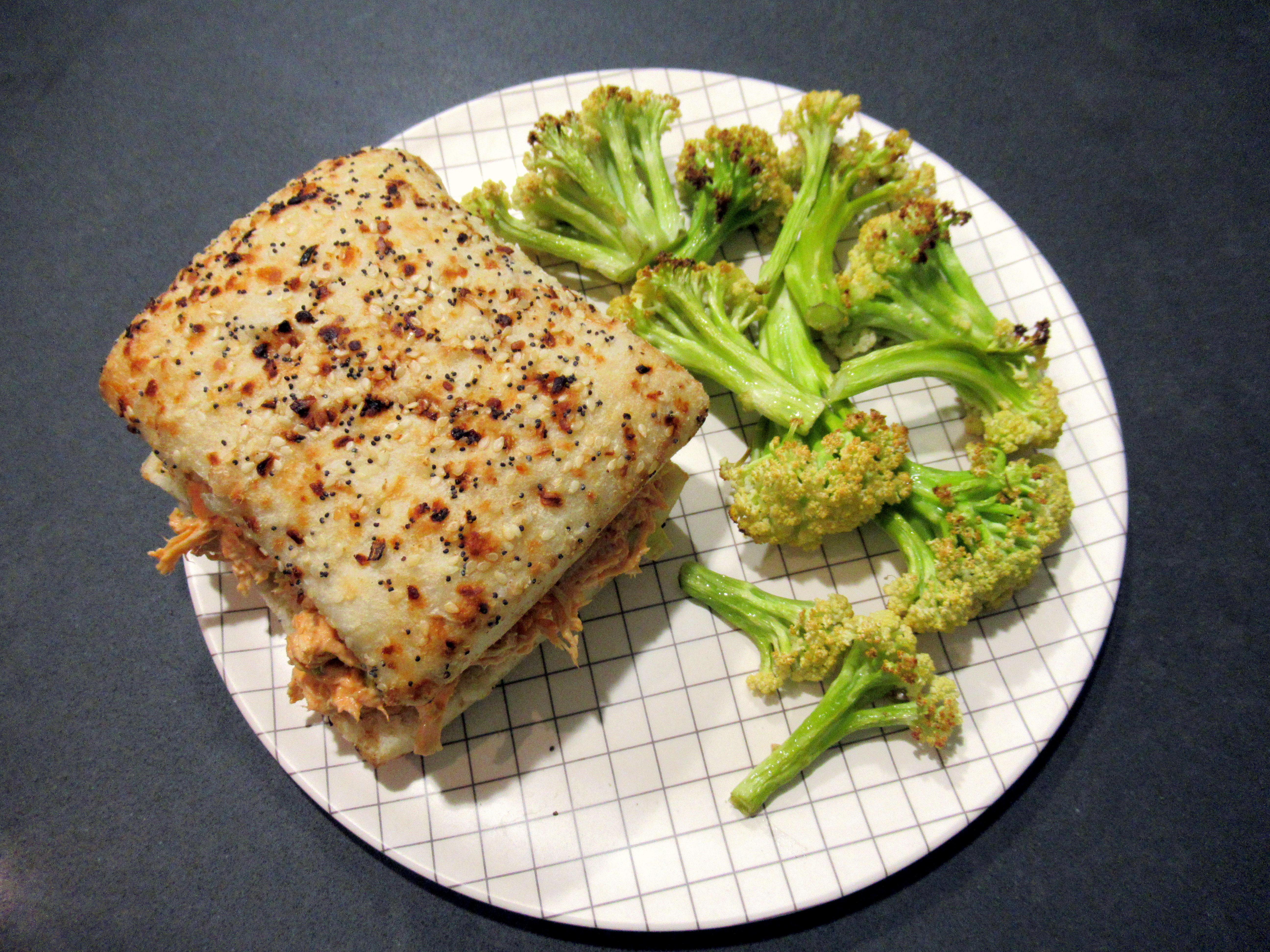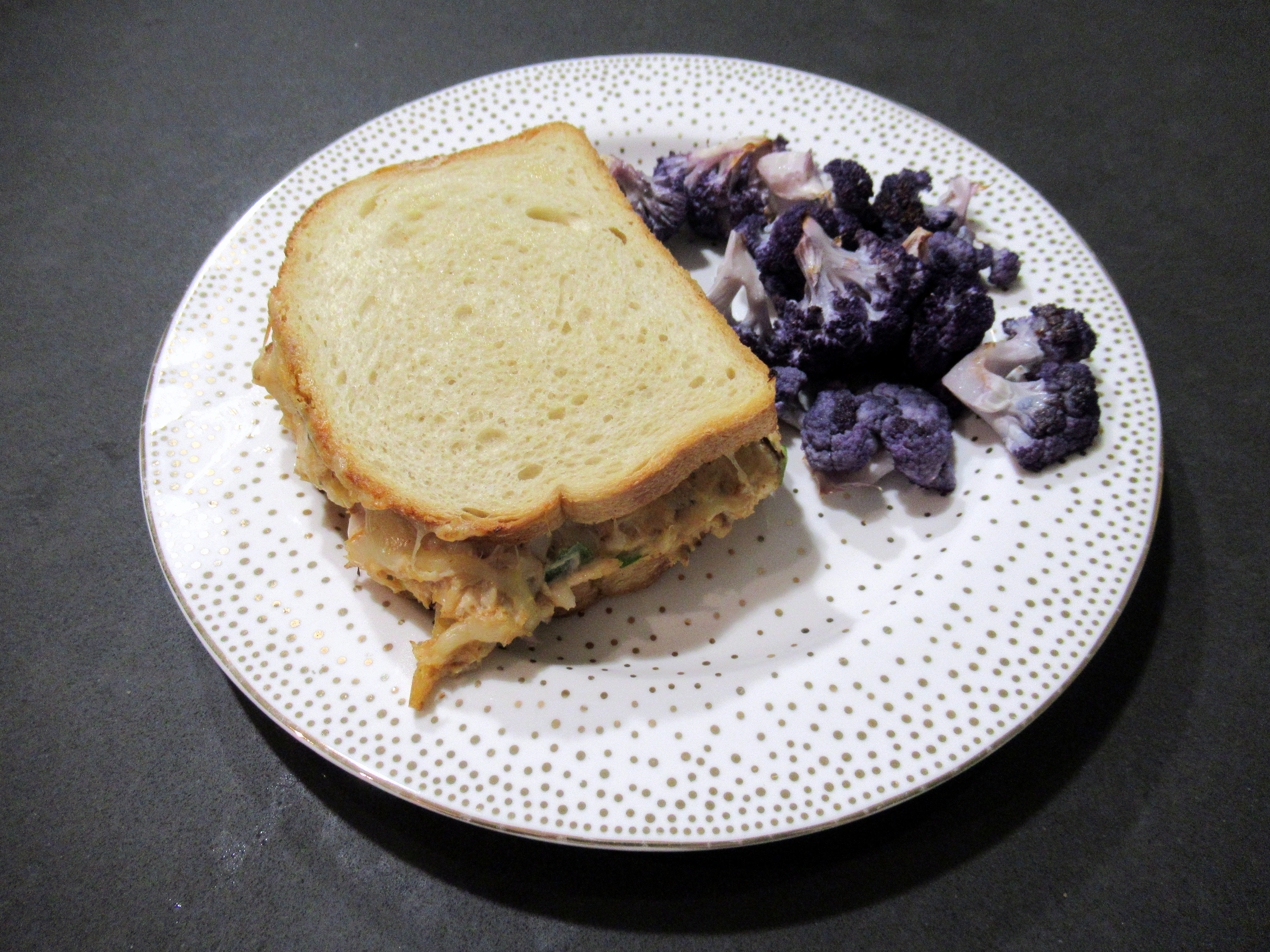 Buffalo chicken salad. Shredded chicken (breasts and thighs cooked in the crockpot – this is our favorite method, especially because it creates a no-salt-added broth for Webster!), mayo, Frank’s, green onion, and celery on an everything ciabatta roll. Plus roasted baby cauliflower.