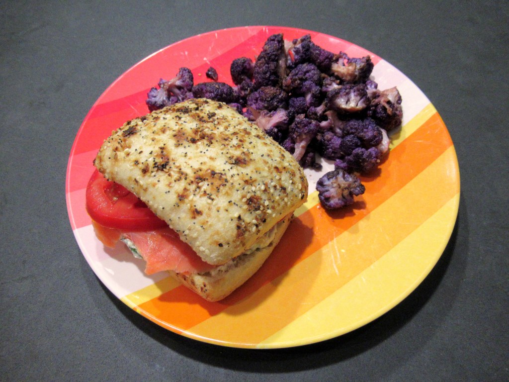 Bagel and lox inspired. Everything ciabatta, homemixed scallion cream cheese, heirloom tomato, smoked sockeye salmon. Plus leftover cauliflower sauted with honey, horseradish, and honey dijon.