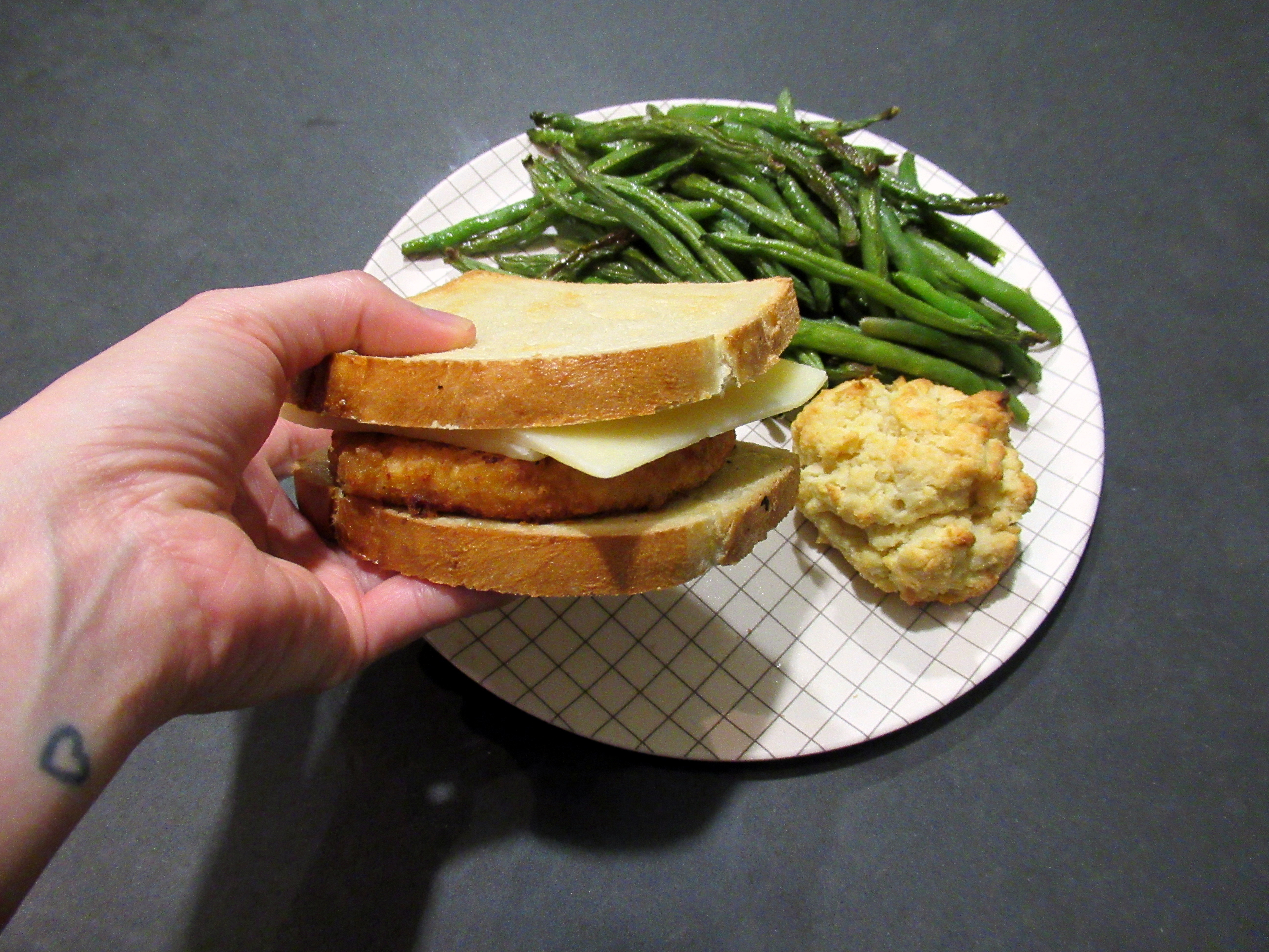 Chicken biscuit-inspired. Sourdough, breaded chicken patties, sharp cheddar, and a maple butter spread. Next to homemade biscuits which ended up being too crumbly to serve chicken on. Plus roasted brussel green beans.