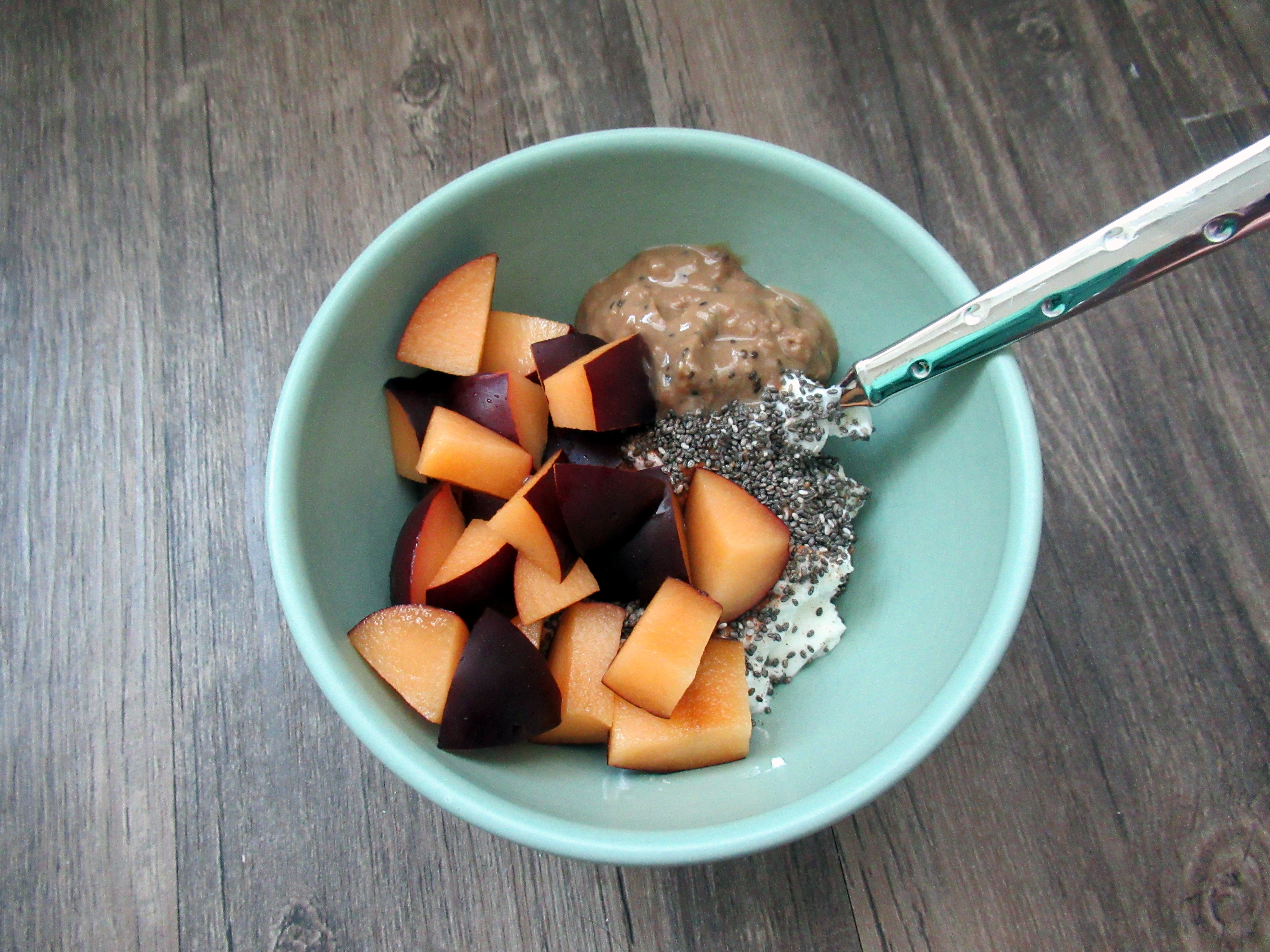 Yogurt bowl with vanilla bean skyr, black plums, cinnamon, chia seeds, and Oaty Nut Butter.