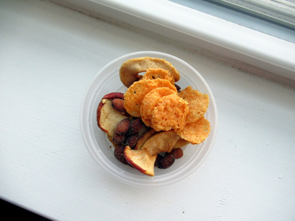Snack mix with dried apple rings, smoked almonds, and cheddar cheese crisps.