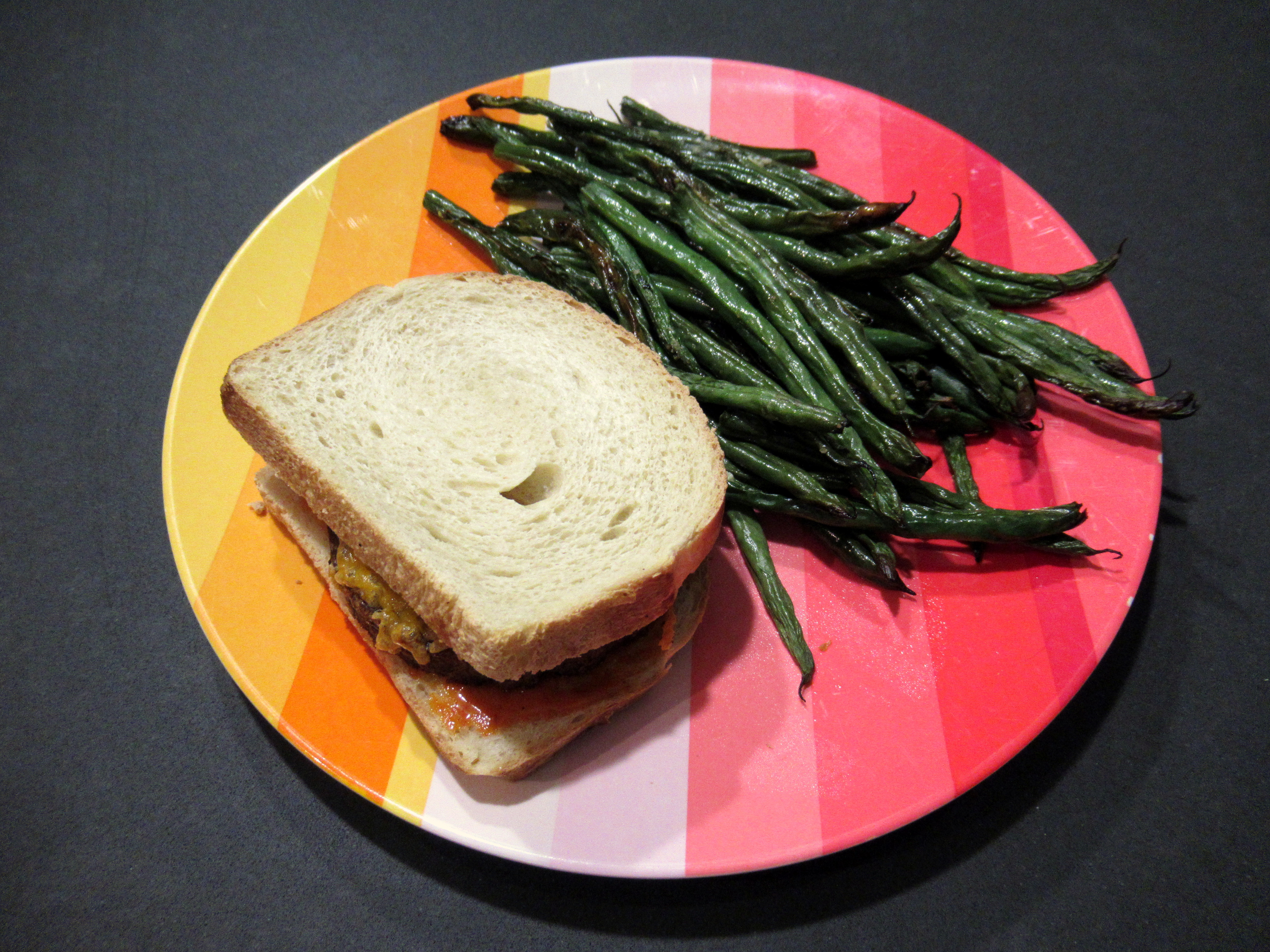 Patty melts. Toasted sourdough, Whole Foods plant-based burgers, sharp cheddar, and Emmy sauce. Plus roasted green beans.